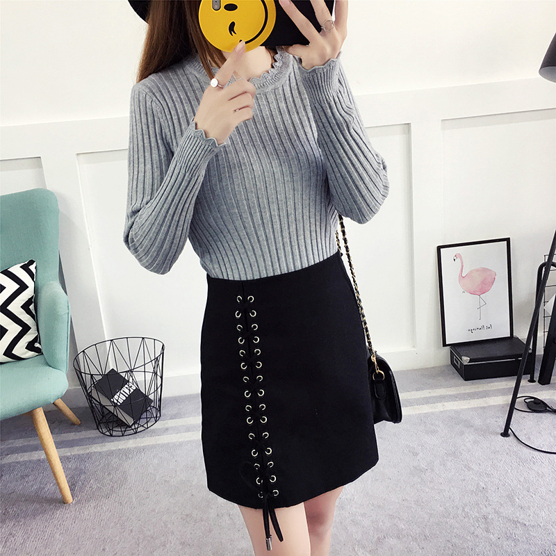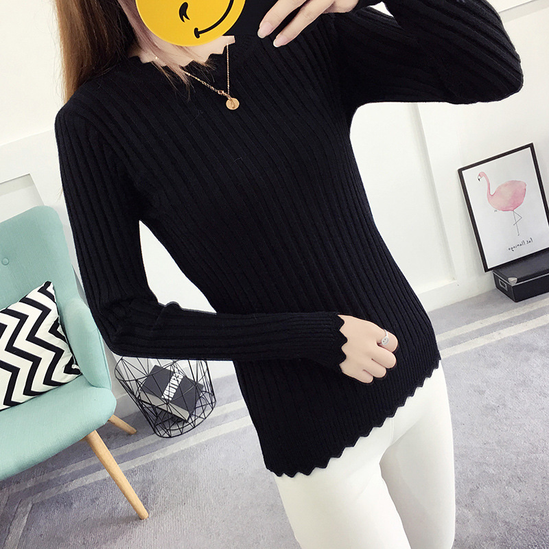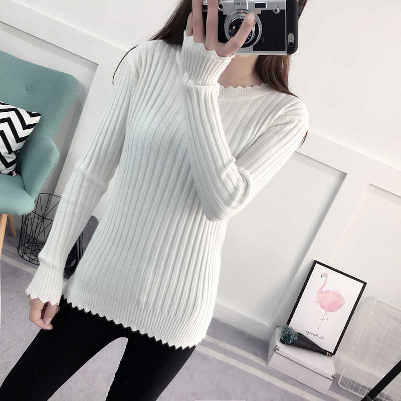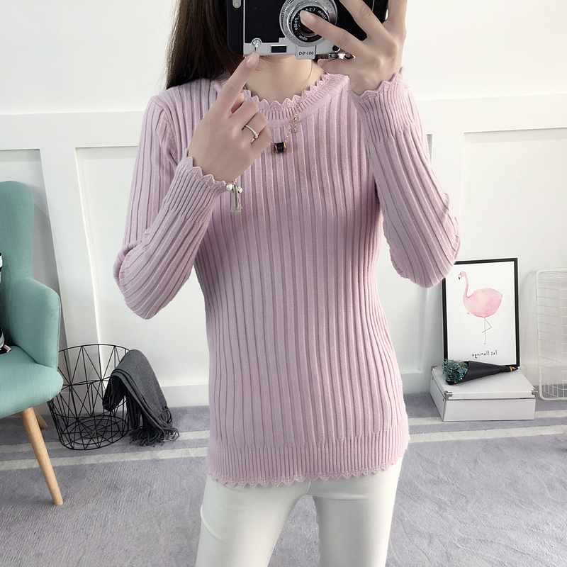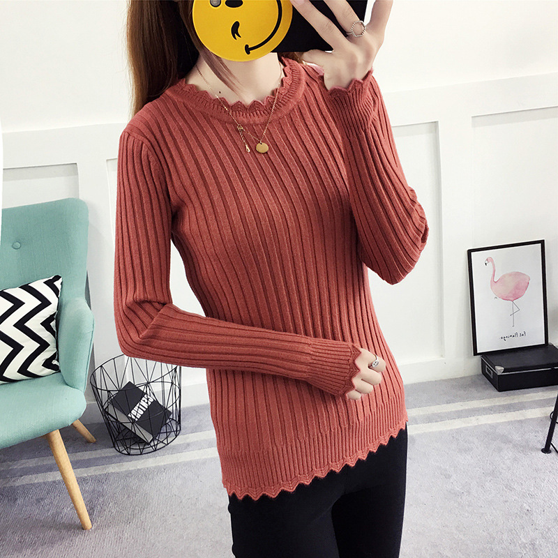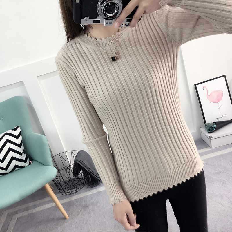 가을과 겨울 새로운 여성용 한국식 풀오버 스웨터 여성용 슬림핏 엘라스틱 레이스 라운드 넥 긴팔 짧은 니트 베이스