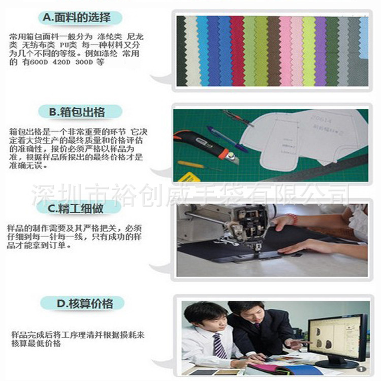 深圳市旺宝母婴有限公司是通过国际质量生产管理体系认证的生产型实体工厂,是融合设计、开发、生产为一体的综合性企业。拥有先进的生产设备、生产工艺。主要生产各式手袋如:证件袋、腰包、妈咪包、尿布垫、宠物袋、汽车收纳箱、束口袋、麻布购物袋、旅行袋挎包、冰袋、笔袋、收纳袋、全棉帆布购物袋、潜水料电脑包、洗漱包,帽子包、化妆袋、公文包、PP编织料购物袋、双肩背包、钱包、无纺布购物袋、烟灰袋、珠宝袋。 公司与多家企业建立了长期的合作关系。热诚欢迎各界朋友前来参观、考察、洽谈业务。