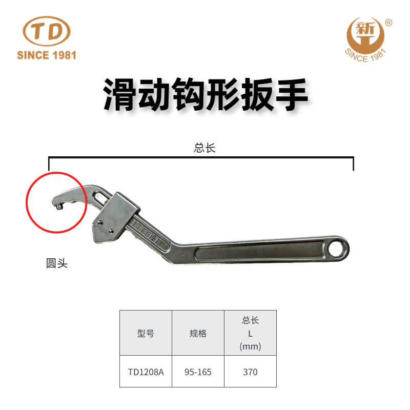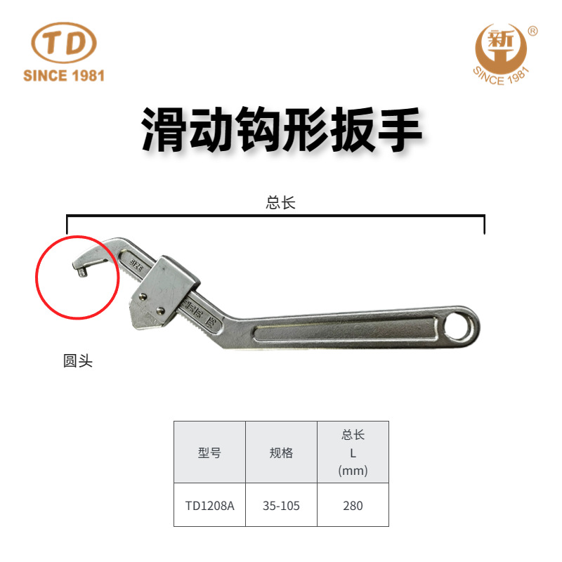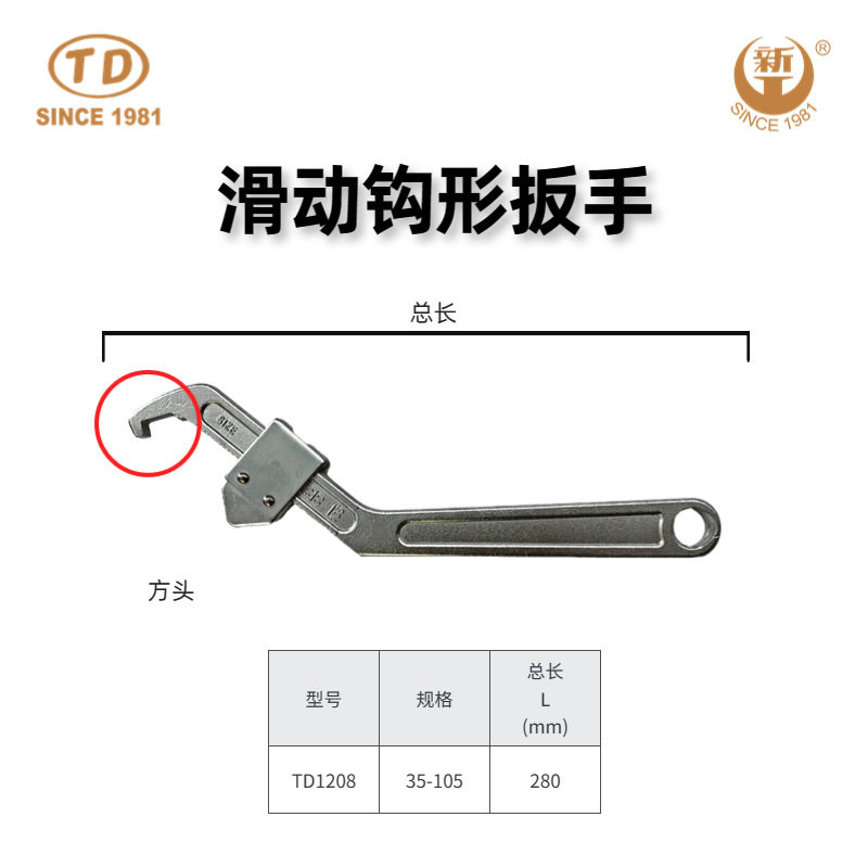 스냅 슬라이더 초승달 렌치 조정 가능한 슬라이딩 라운드 헤드/스퀘어 헤드 후크 렌치 TD1208A/TD1208