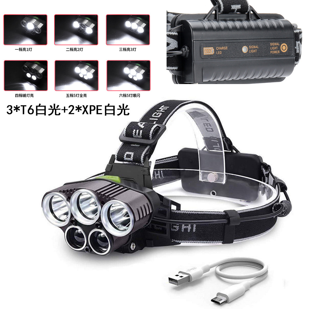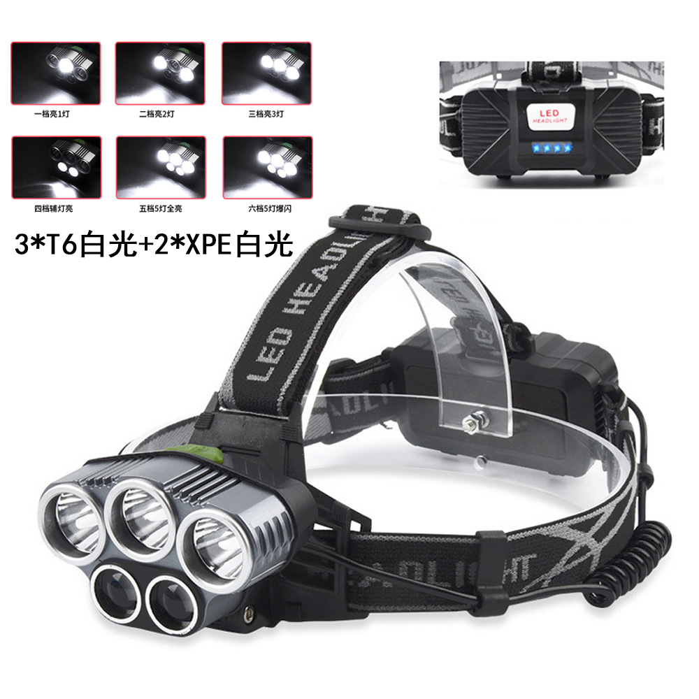 产品功能:① 3*T6白光+2*XPE白光款:6模式(1档亮1灯,2档亮2灯,3档上3灯亮,4档亮下2灯,5档5灯全亮,6档爆闪),② 3*T6白光+2*XPE蓝光款:5模式(1档亮1灯,2档亮2灯,3档下2灯蓝光亮,4档上3灯亮,5档爆闪) , 电池仓警示灯2档位(1档红光常亮,2档红光闪光),USB充电接口 ,电池仓充电指示灯(充电时亮红灯,充满电亮绿灯)