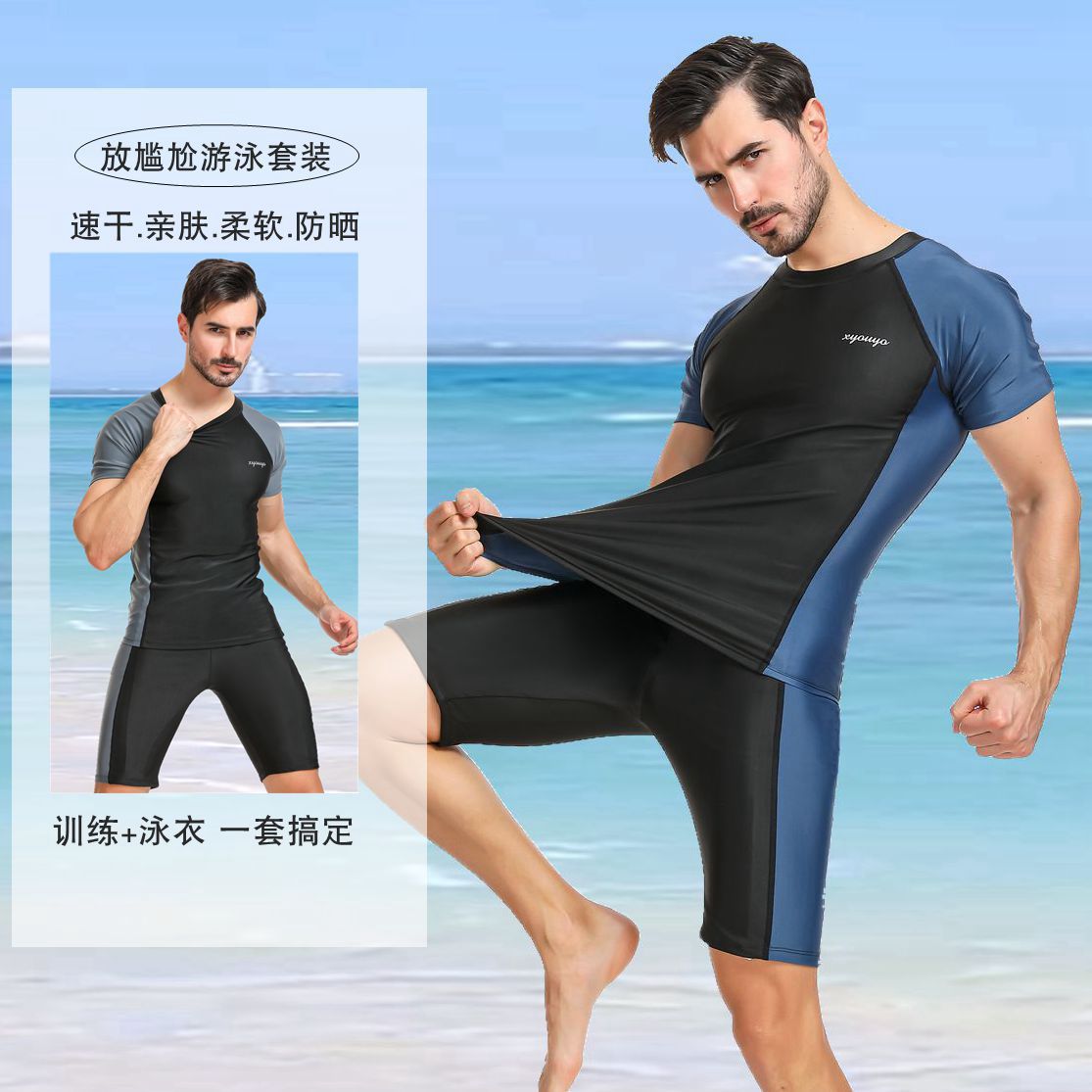 男式泳衣套装平角五分裤潜水防晒肥佬泳裤泡温泉沙滩拼色短袖分体