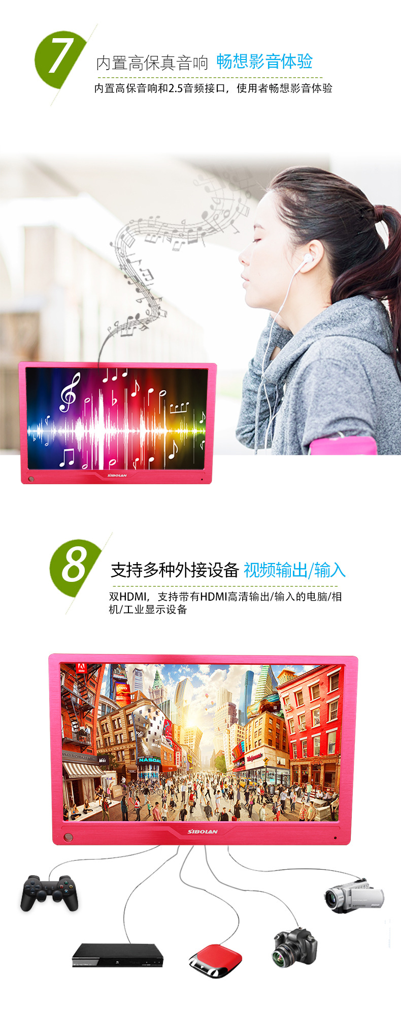 7、音频输出:2.5音频口,内置腔体喇叭(无需外接音箱)