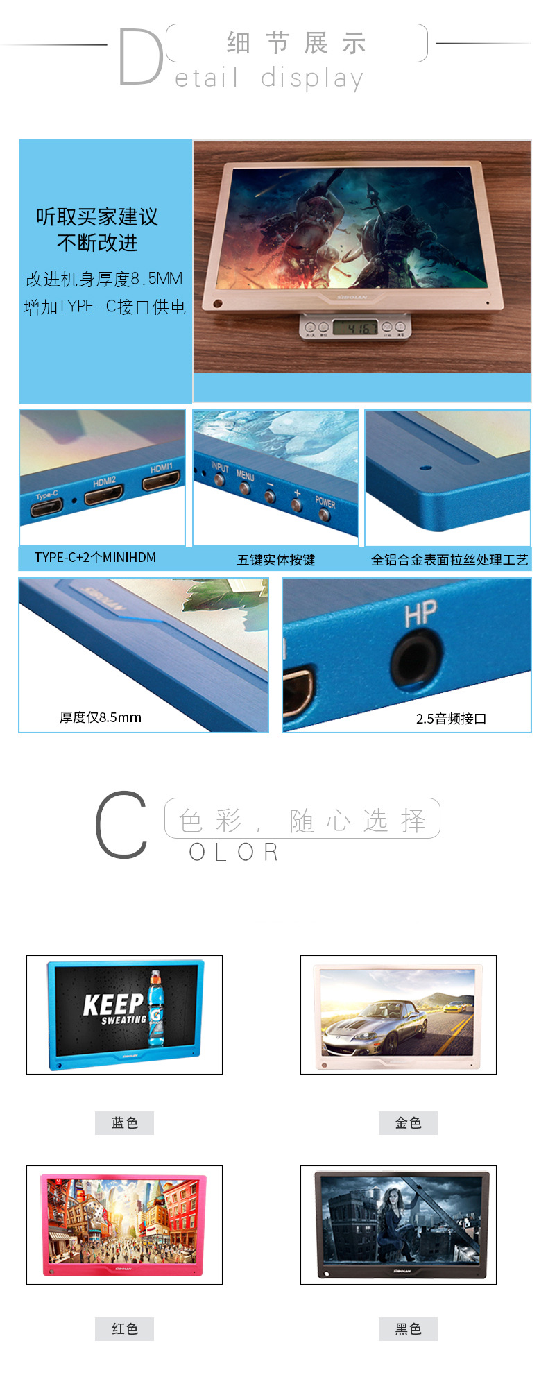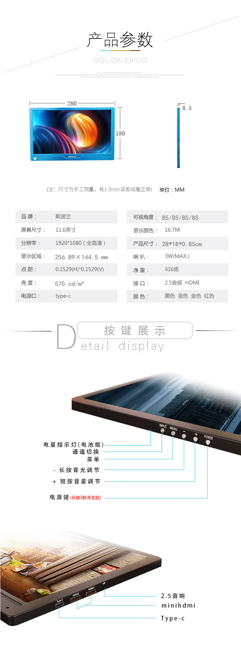 斯波兰 11.6英寸1080P-HDR便携显示器