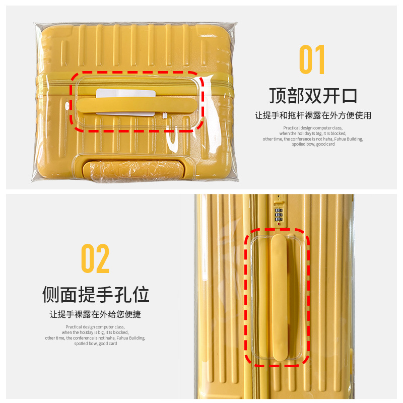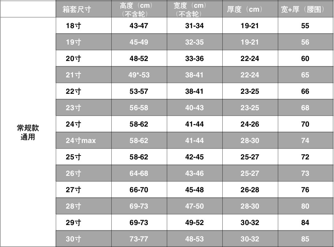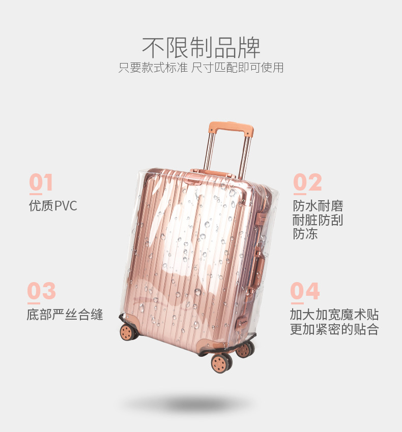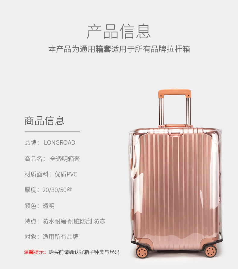 2.由于市面拉杆箱尺寸款式太多,不能保证每款箱子都是可以使用的,请根据箱子实际的长宽高购买对应保护套或咨询客服