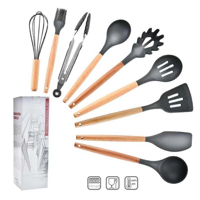 아마존 크로스 보더 재고 나무 손잡이 실리콘 주방 용품 11 조각 세트 9 조각 주방 도구 삽 숟가락 세트