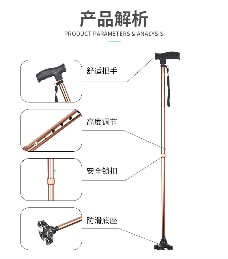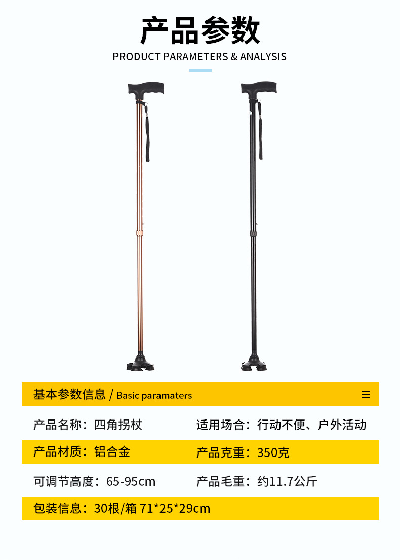 두꺼운 알루미늄 합금 개폐식 4 족 목발, 높이 조절 가능 워킹 스틱 노인용 미끄럼 방지 등반 스틱