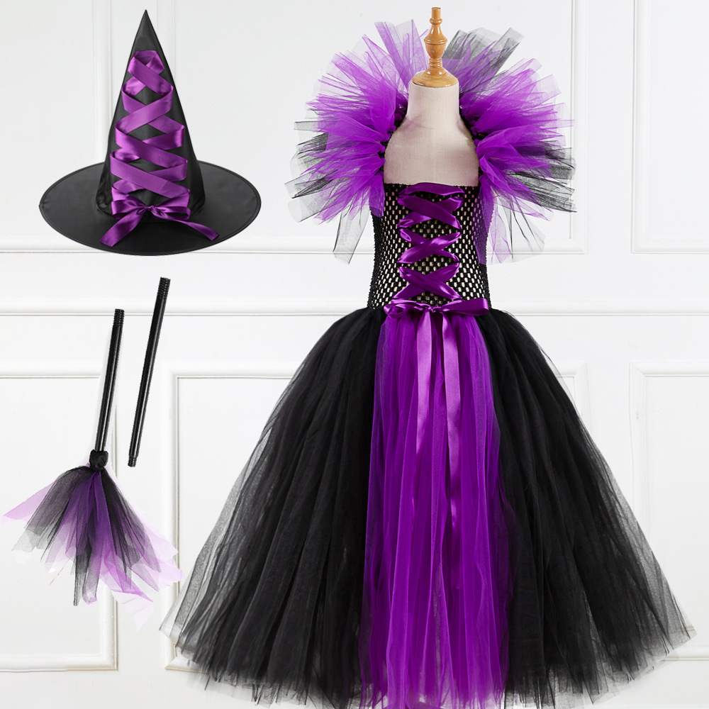 할로윈 유럽과 미국 어린이 착용 긴 마녀 소녀 원피스 티아라 성능 메쉬 원피스 유령 축제 공주 원피스