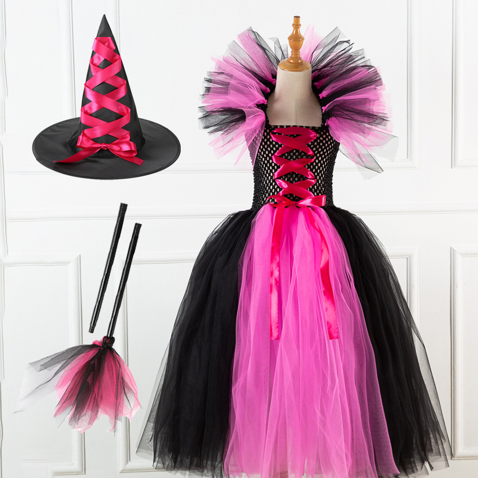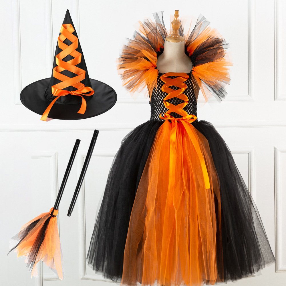 • 万圣节欧美童装长款女巫女童连衣裙送头饰表演网纱礼服鬼节公主裙