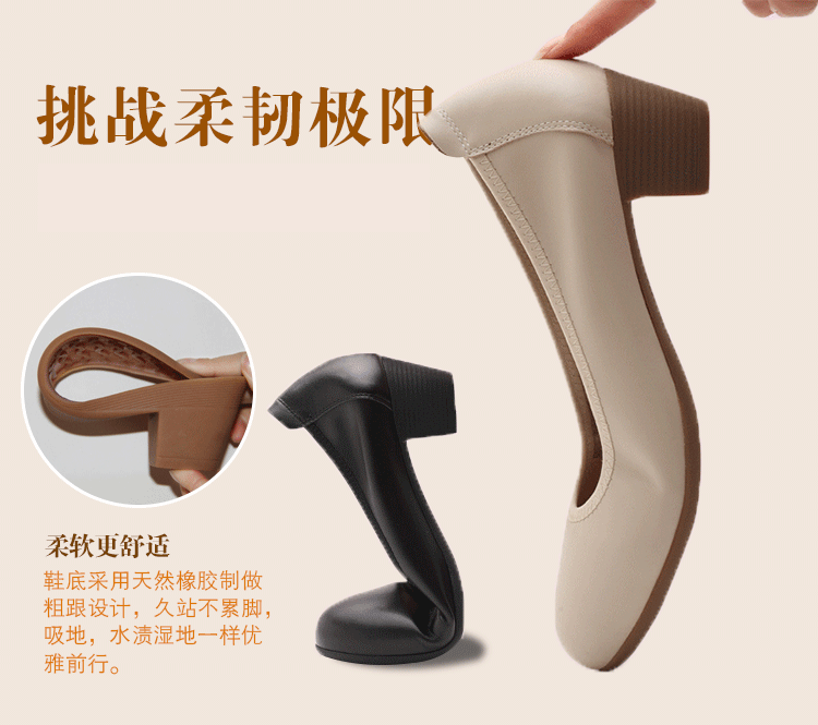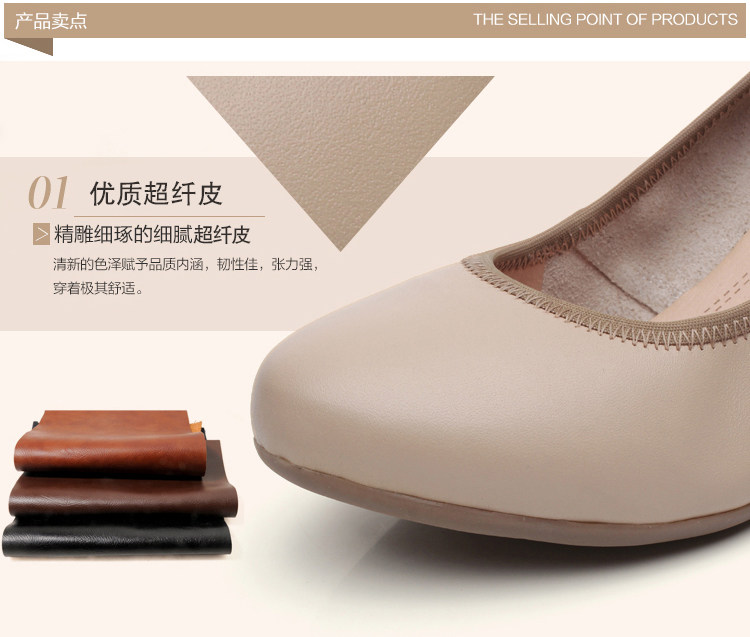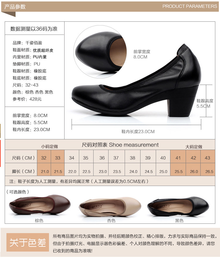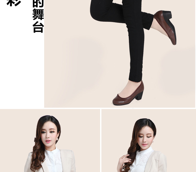 春秋真 皮黑色尖头职业工作鞋粗跟防水台高跟鞋浅口单鞋一字扣女鞋