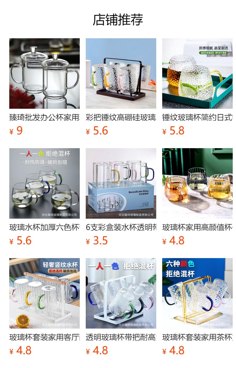 공장에서 제작한 두꺼운 유리컵, 고붕규산염 손잡이가 있는 물컵, 6가지 색상의 차컵, 내열성 일회용 공푸차컵