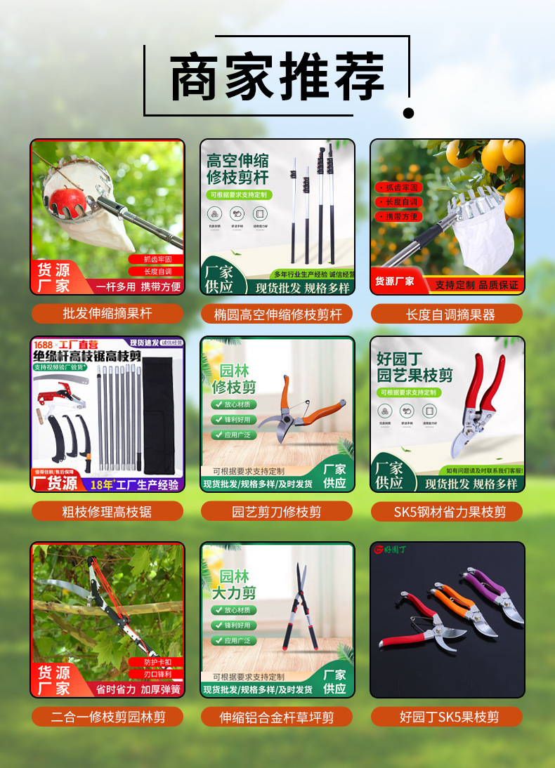本厂主要生产:果枝剪、大力剪、高枝剪、果树锯等系列产品。产品齐全,质量可靠。欢迎来样来图,定牌加工制作。