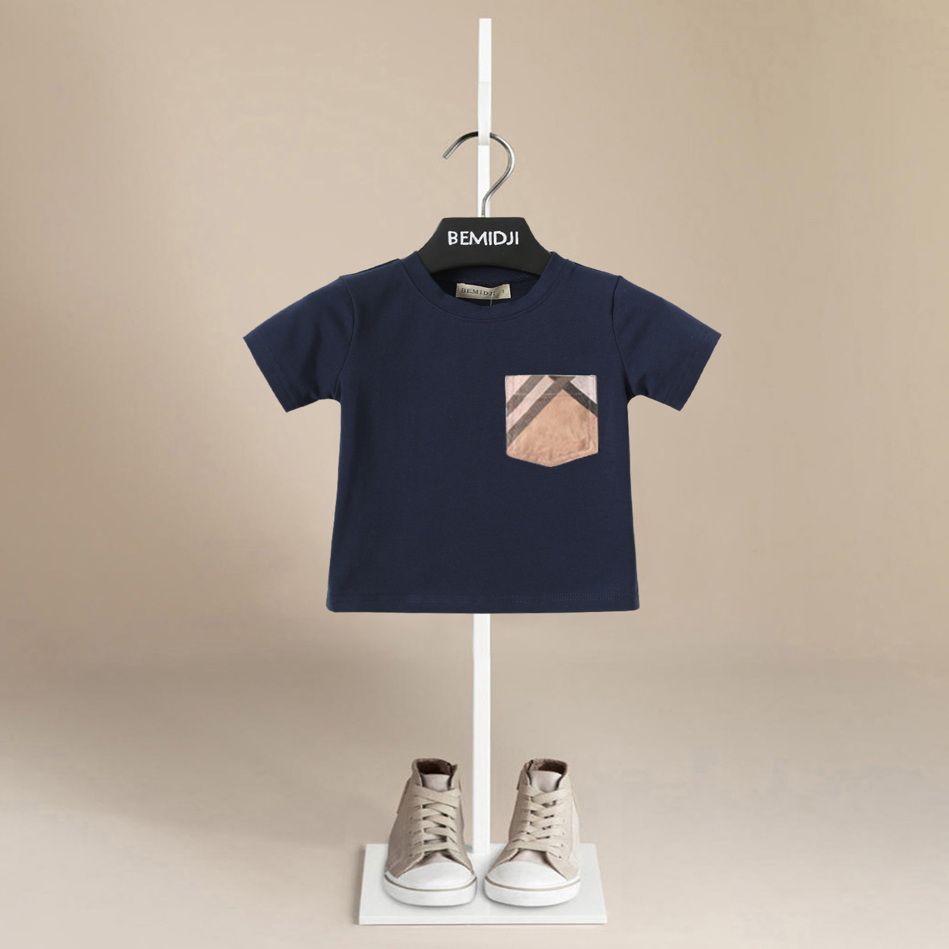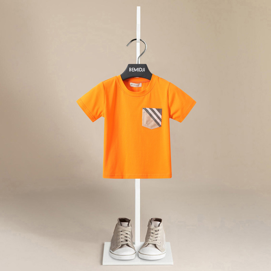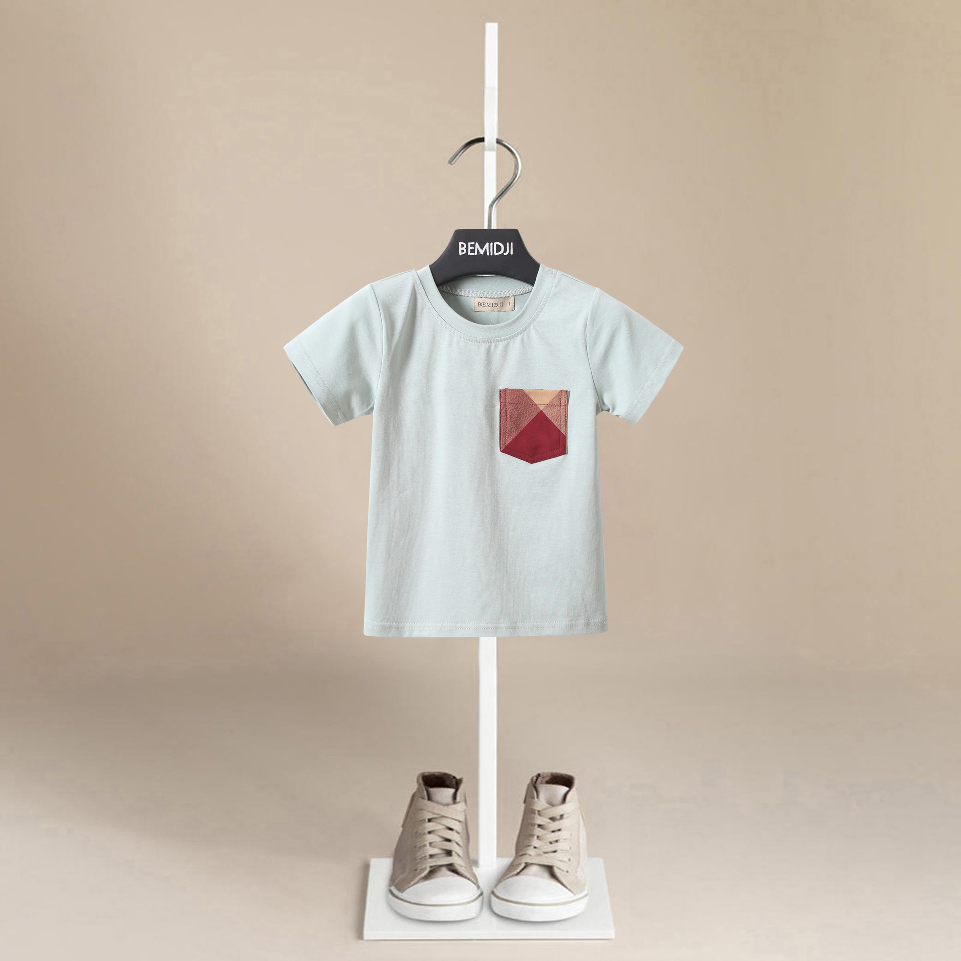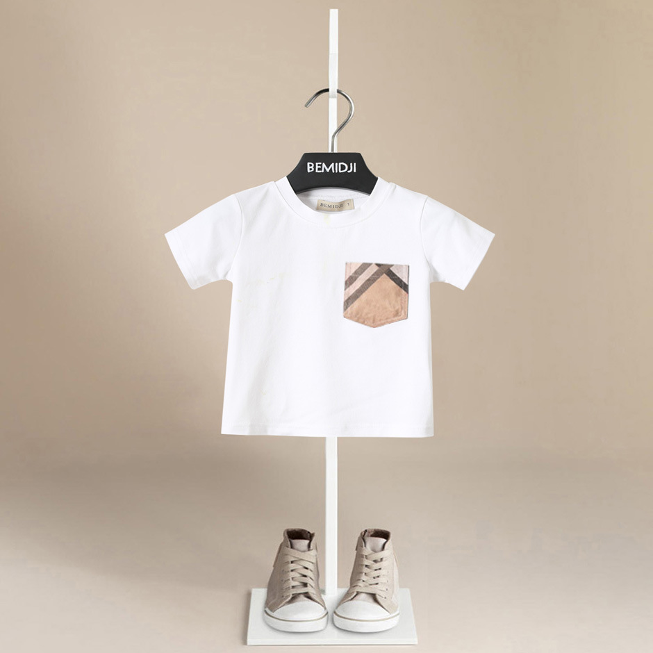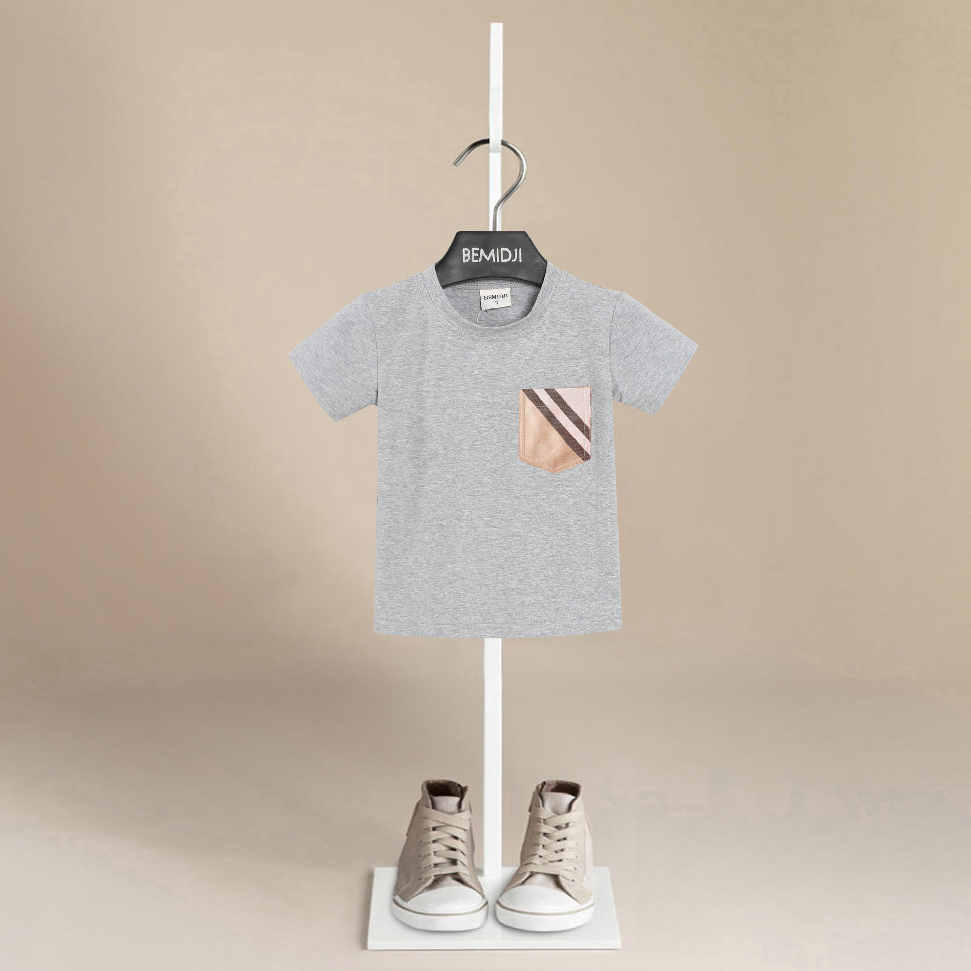 어린이 라운드 넥 티셔츠 풀 프레임 코튼 가슴 작은 포켓 여름 캐주얼 반팔 아동 의류 도매 Bemiji