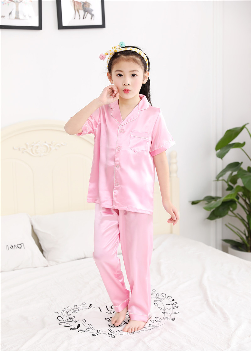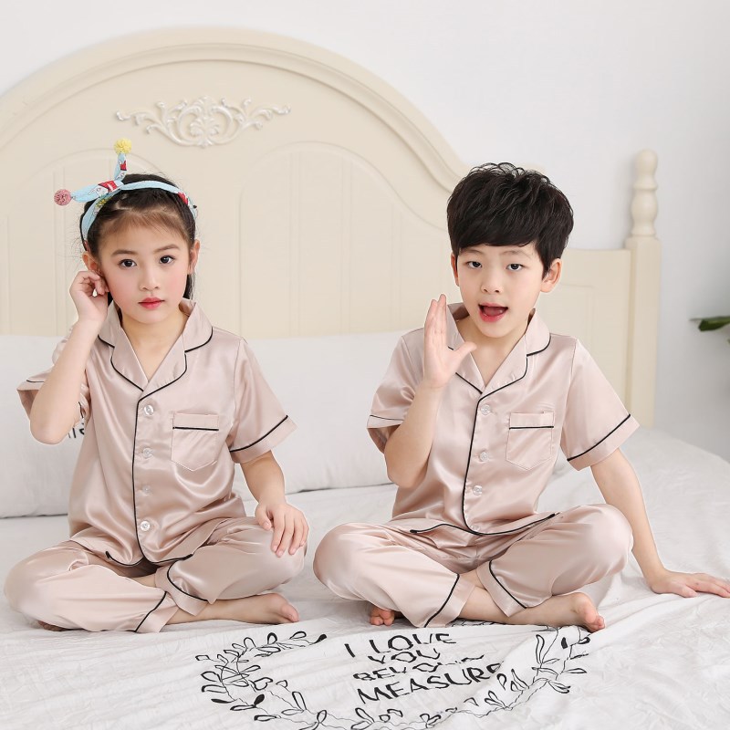 어린이 잠옷 봄과 여름 반팔 반바지 소년 얇은 가정 옷 소녀 실크 실크 잠옷 세트 에어컨 옷스토어 가기