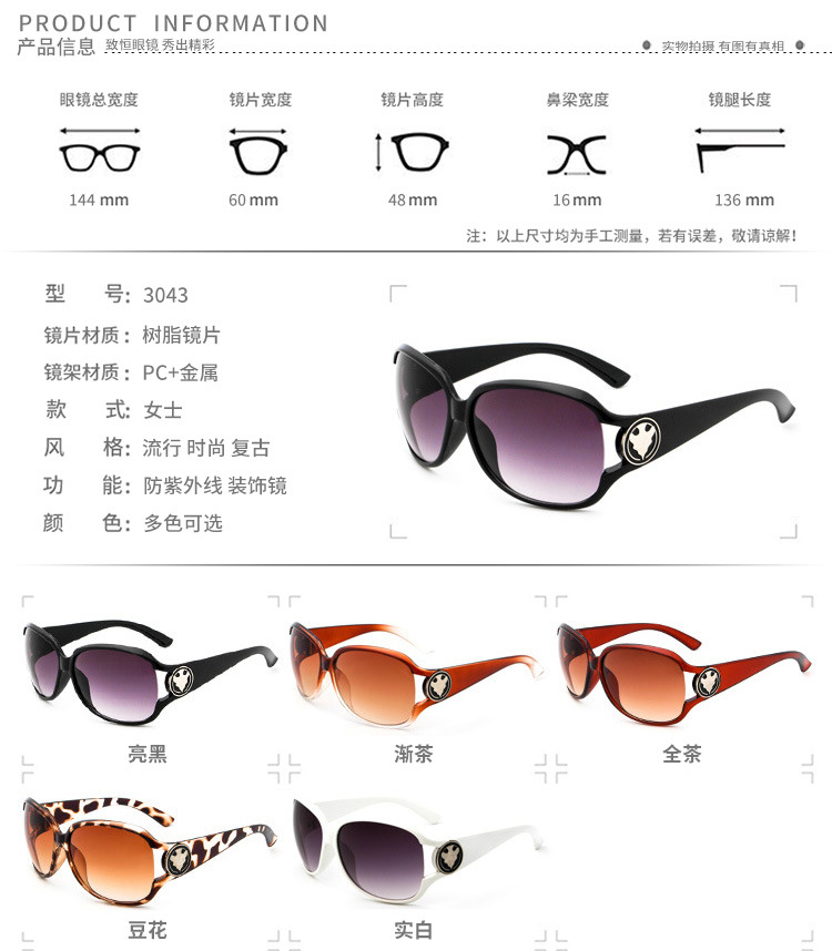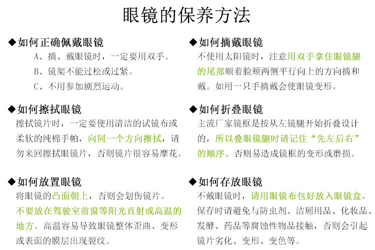 1、注明需求。 拍下前请尽可能多的了解商品,如有不清楚的地方请留言询问,客服会尽快回复您。2、货源充足。 本店宝贝数量充足,亲可以放心拍。暂时缺货将会在宝贝展示图上标明。如偶有断货现象来不及更新,本店将会及时与买家联系并协商解决办法。还请大家谅解。3、色差问题。 本店所有商品均为实物拍摄,因技术、显示器、光线、环境原因可能稍有色差现象,这属于正常现象,敬请理解,对色差高度敏感的买家请到实体店试戴后再来拍。4、退换货处理。 买家在收到货时,在10天内请仔细检查商品,如有镜架断裂、脱皮、镜片有大面积划痕的质量问题,可联系客服退换货,如超过10天本店不接受退换货。我们无法保证每个产品都完好,有小的瑕疵问题,我们不接受退换货,还望谅解! 5、签收须知 当您收到包裹的时候,请不要急于在收货单上签字,请当着快递人员的面打开当场验货,如宝贝有损坏或数量缺少请拒收!并当场联系掌柜(快递单上有联系电话)。如果签字即表示您对货品的数量内容及完好性予以认可,掌柜将无法为买家们向快递公司索赔了!也请恕本店不再承担由货品内容不符、缺少或者损坏造成的损失!收到物品后有任何问题请及时联系我们!掌柜与买家一起解决问题!!