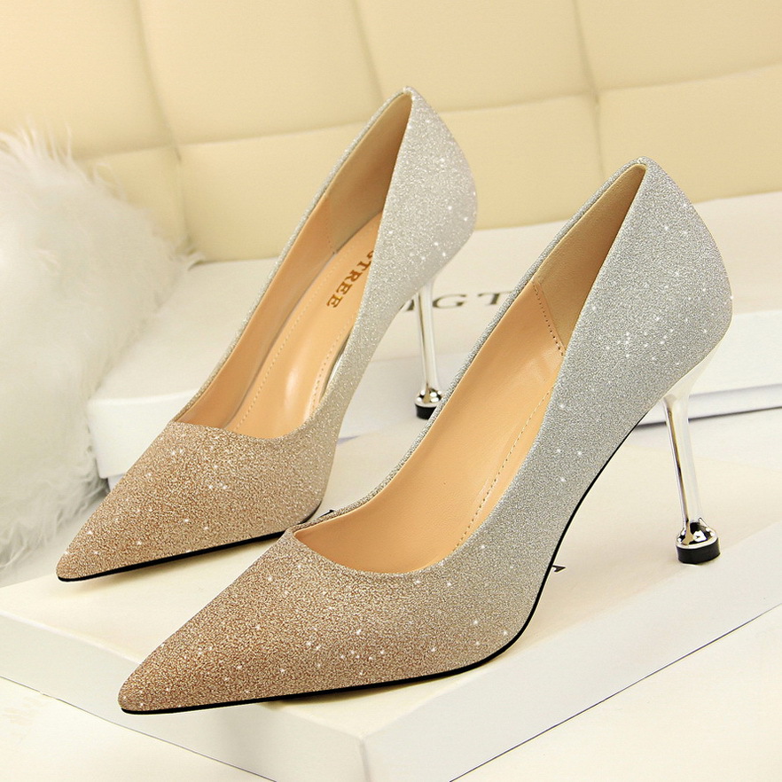 0755-1 한국 패션 얇은 뒤꿈치 하이힐 낮은 입 뾰족한 반짝이는 컬러 그라디언트 컬러 매칭 신발 하이힐 여성 신발스토어 가기
