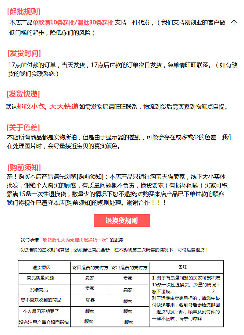 默认速递为中通快递/圆通快递,如买家没有特别说明,店主将根据实际情况安排发货。
