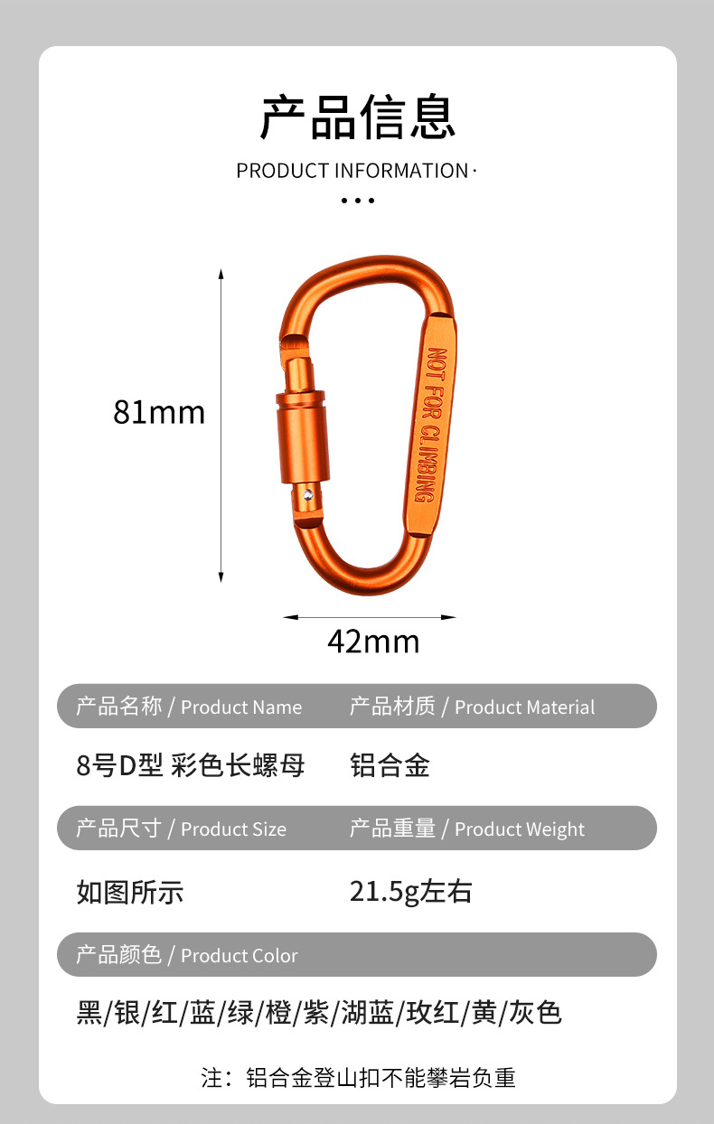 제조업체 도매 D자형 두꺼운 알루미늄 합금 카라비너 야외 용품 스포츠 배낭 버클 잠금 버클 8자형 버클 안전 버클