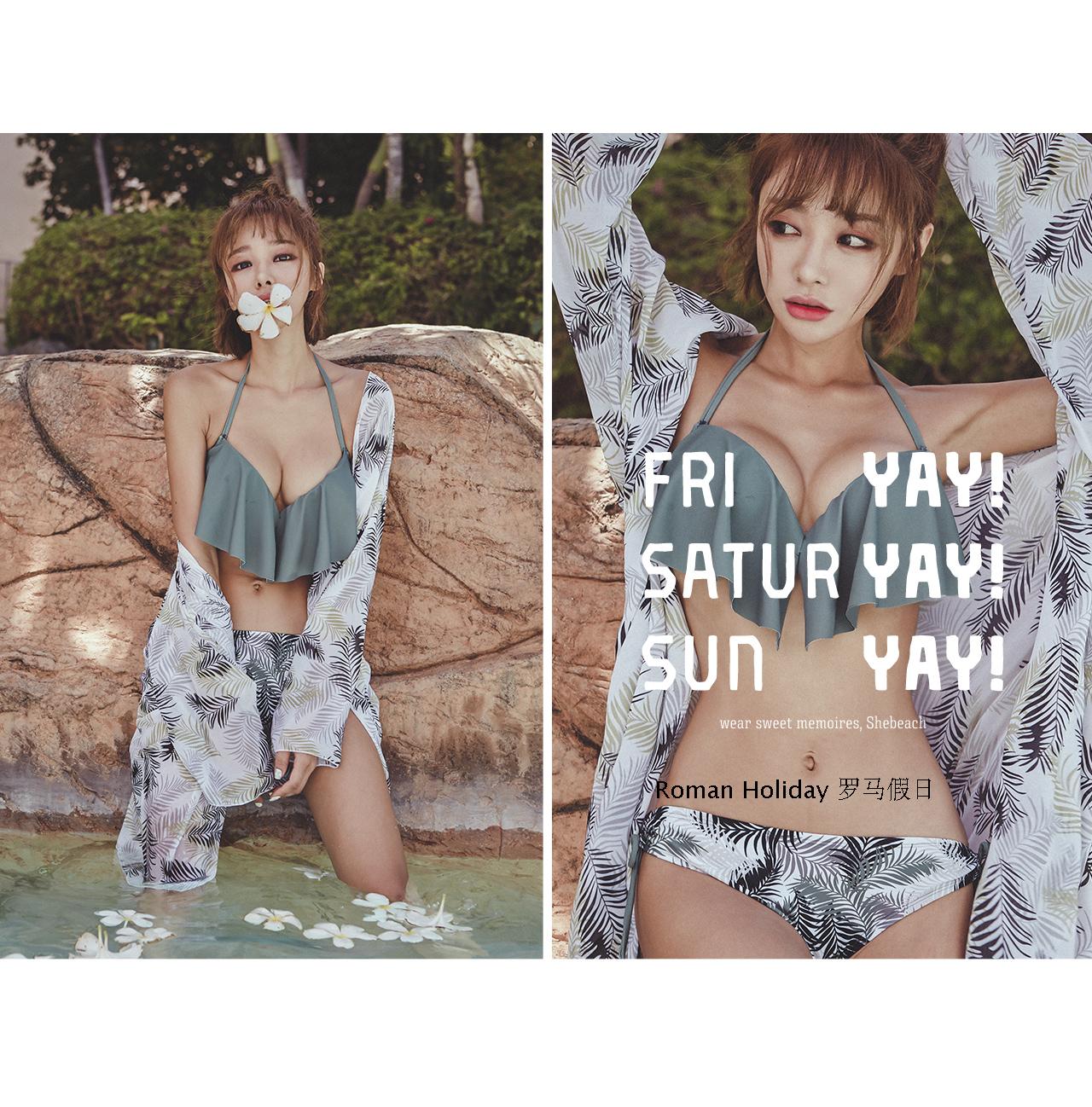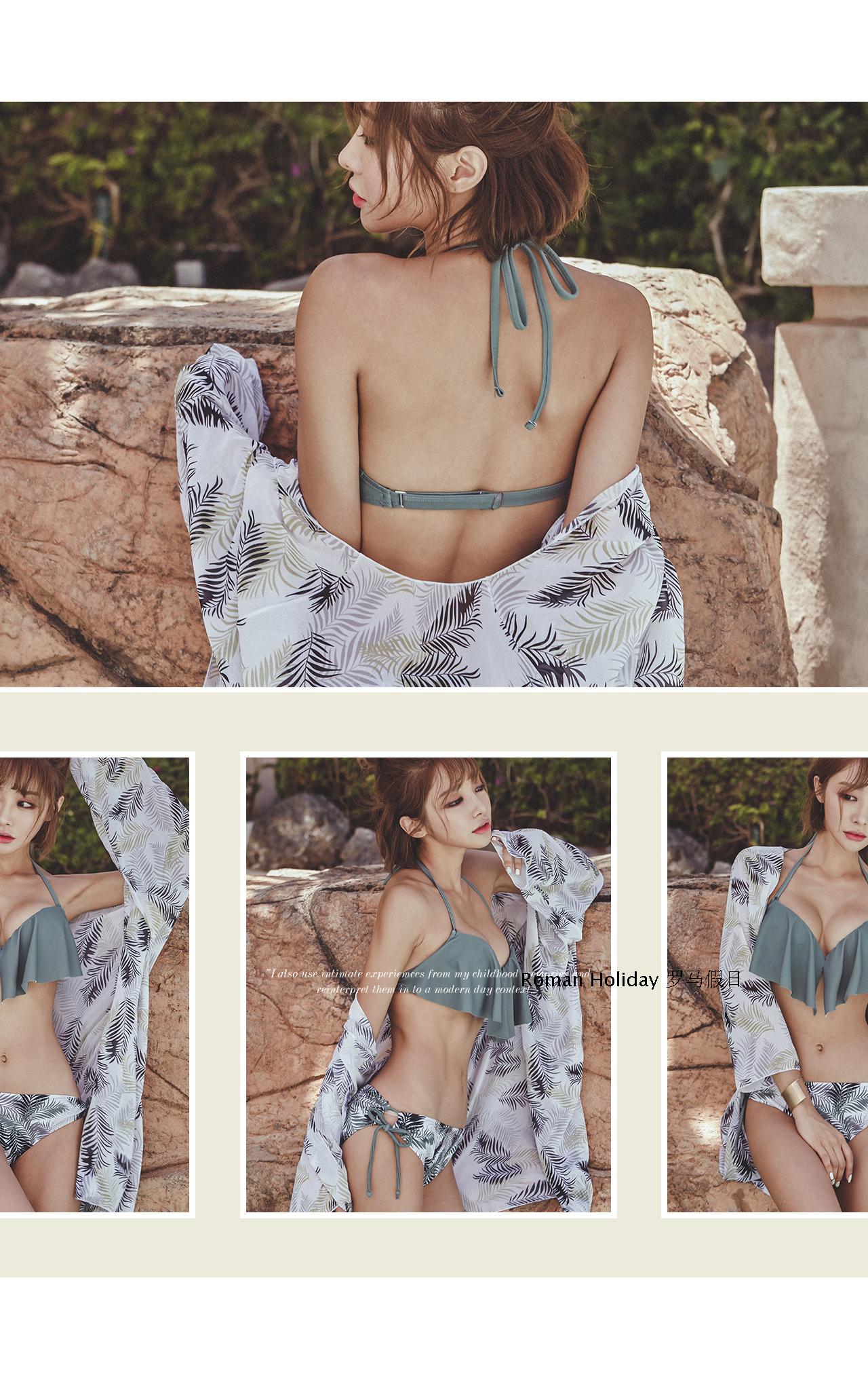 한국 비키니 새로운 블루 그레이 우아한 프릴 푸시 업 가슴 수영복 여성용 쓰리 피스 자외선 차단제 외부 셔츠