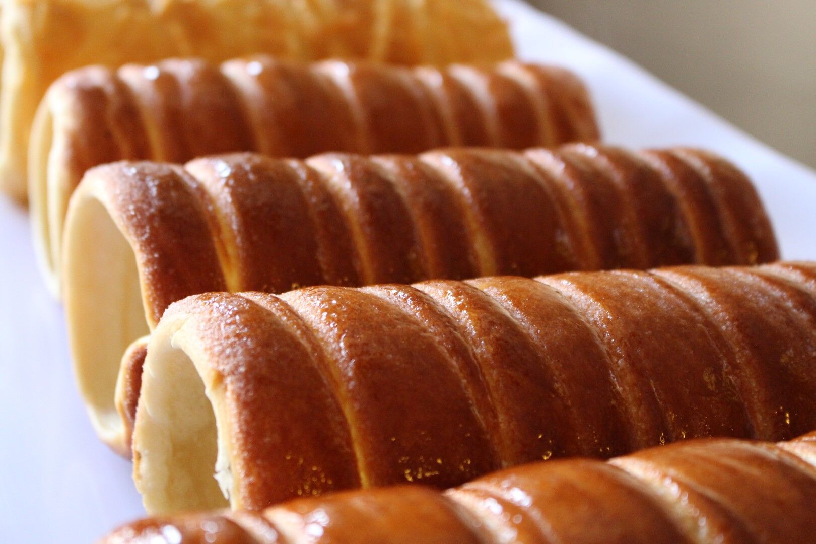 烟囱卷是流传自17世纪东欧匈牙利的经典美食。英文叫Chimney Cake,它看起来像面包卷,把螺旋形的面团卷在烤架上烘烤,烤好时好像烟囱一样冒烟,形状也像烟囱,因此称作烟囱卷,但它有别于一般的面包,外层香酥,内层松软。