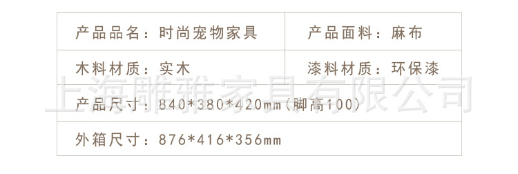 上海雕雅家具有限公司是专业制造宠物沙发,狗窝,猫咪用品,宠物木制品,软包等家具。 工厂坐落:江苏省南通市海安县老坝岗镇滨江家具产业园 公司有国内极少数的标准化流水线,工厂管理经营者在台资企业有近20年生产管理经验,公司设备齐全,技术人员成熟,可根据客户提供图纸,开发新款式。 公司紧抓市场潮流,提供个性定制标准化生产,公司工厂近9000平方米。 本公司是工厂直供,期待您到工厂参观考察!