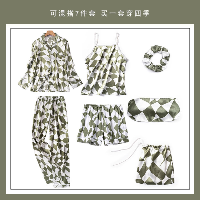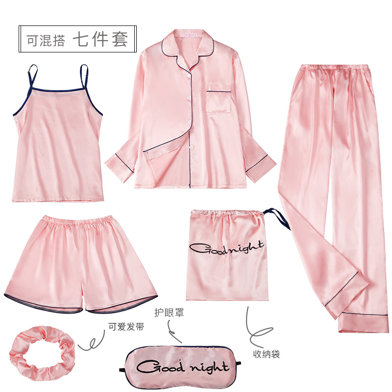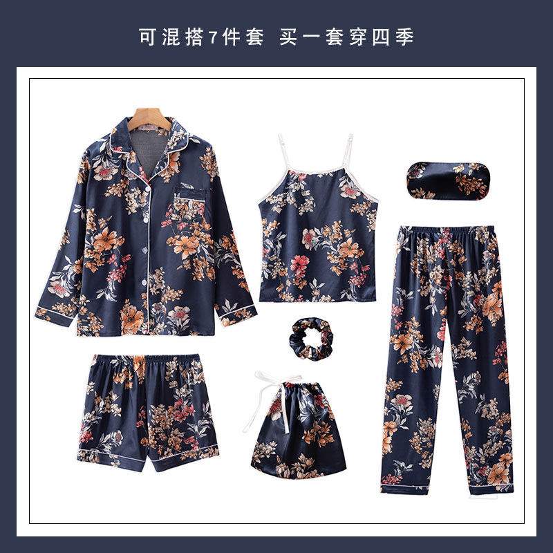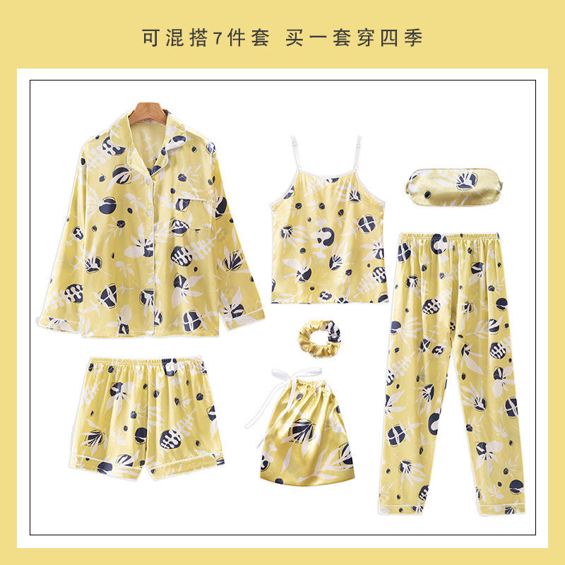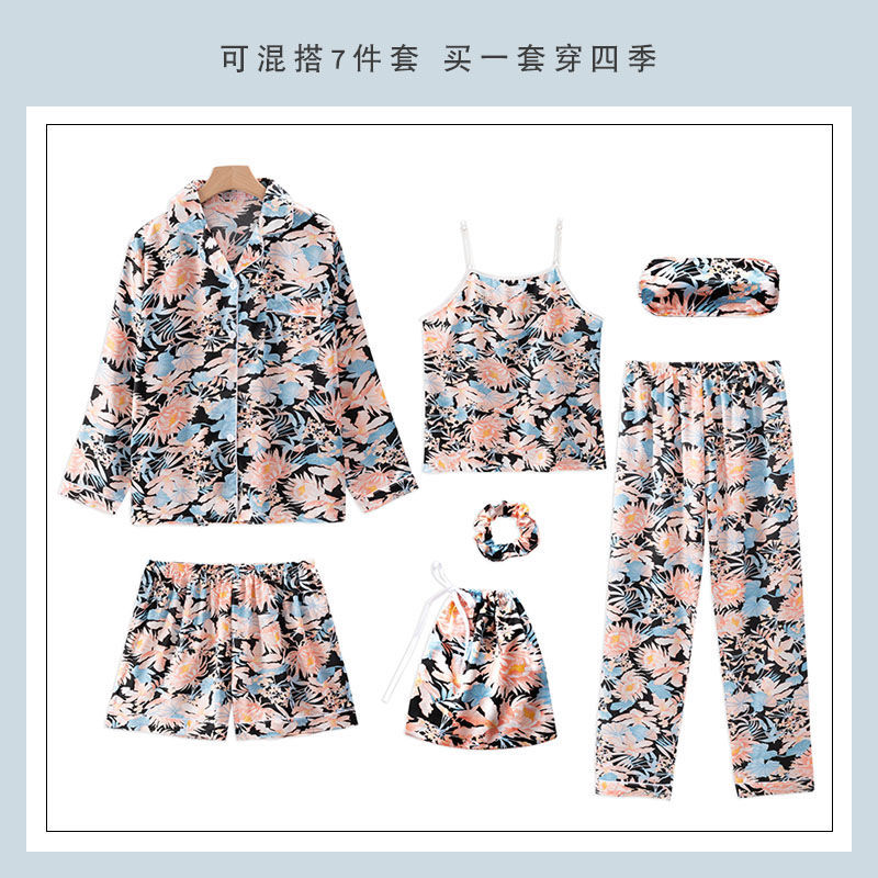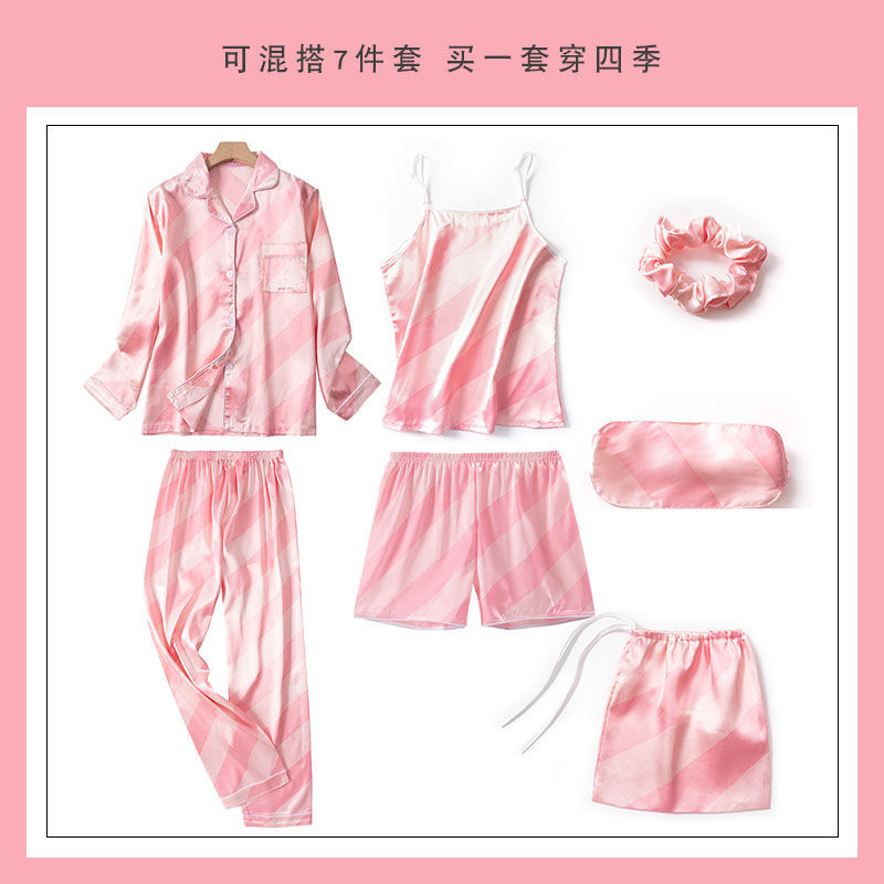 잠옷 여자의 봄 가을 여름 사계절 7 종 세트 긴팔 반바지 슬링 스트라이프 실크 가정 옷 세트 잠옷 대외 무역