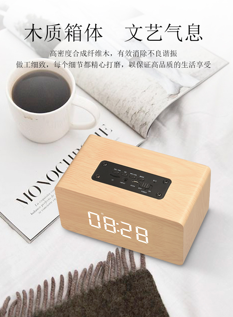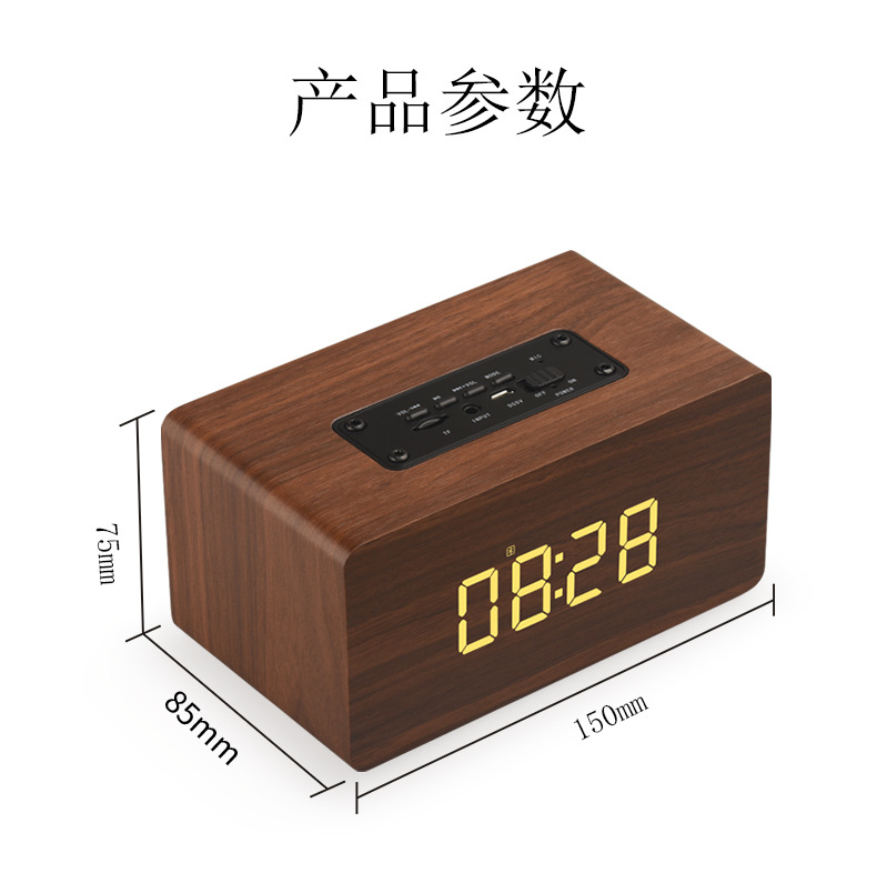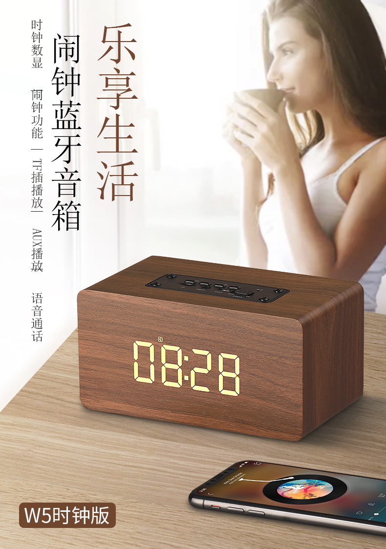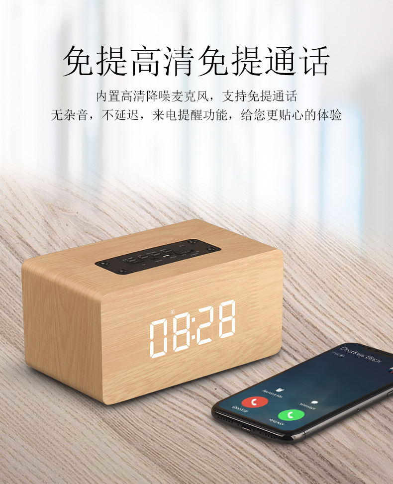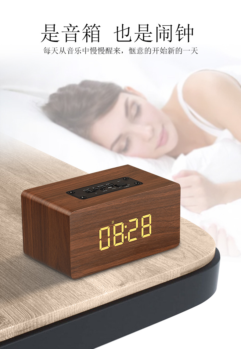 关于FM功能:此款《W5C时钟版》木质蓝牙音箱以蓝牙和插卡为主功能,并附带FM功能,并不能保障每一个地区都能搜到台,若FM收不到台,请联系客服,沟通使用方式