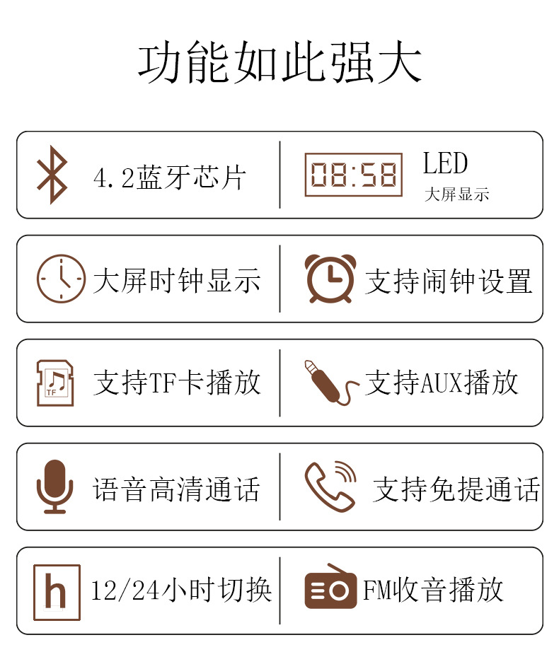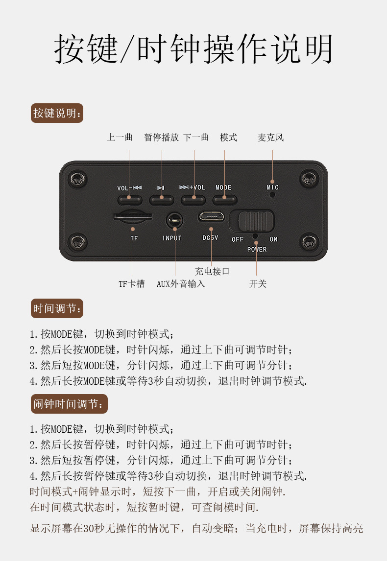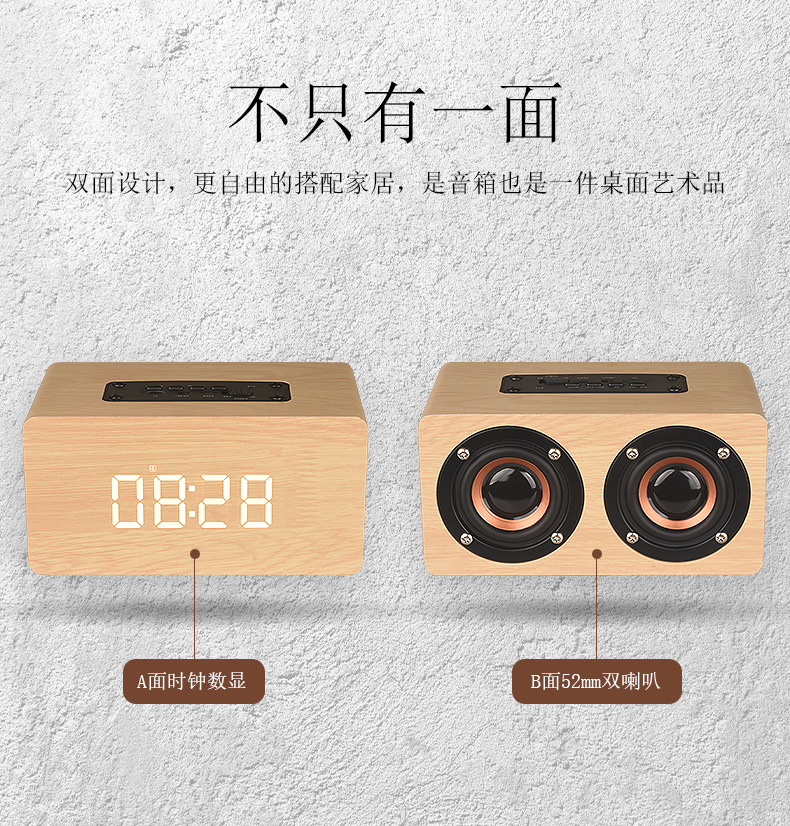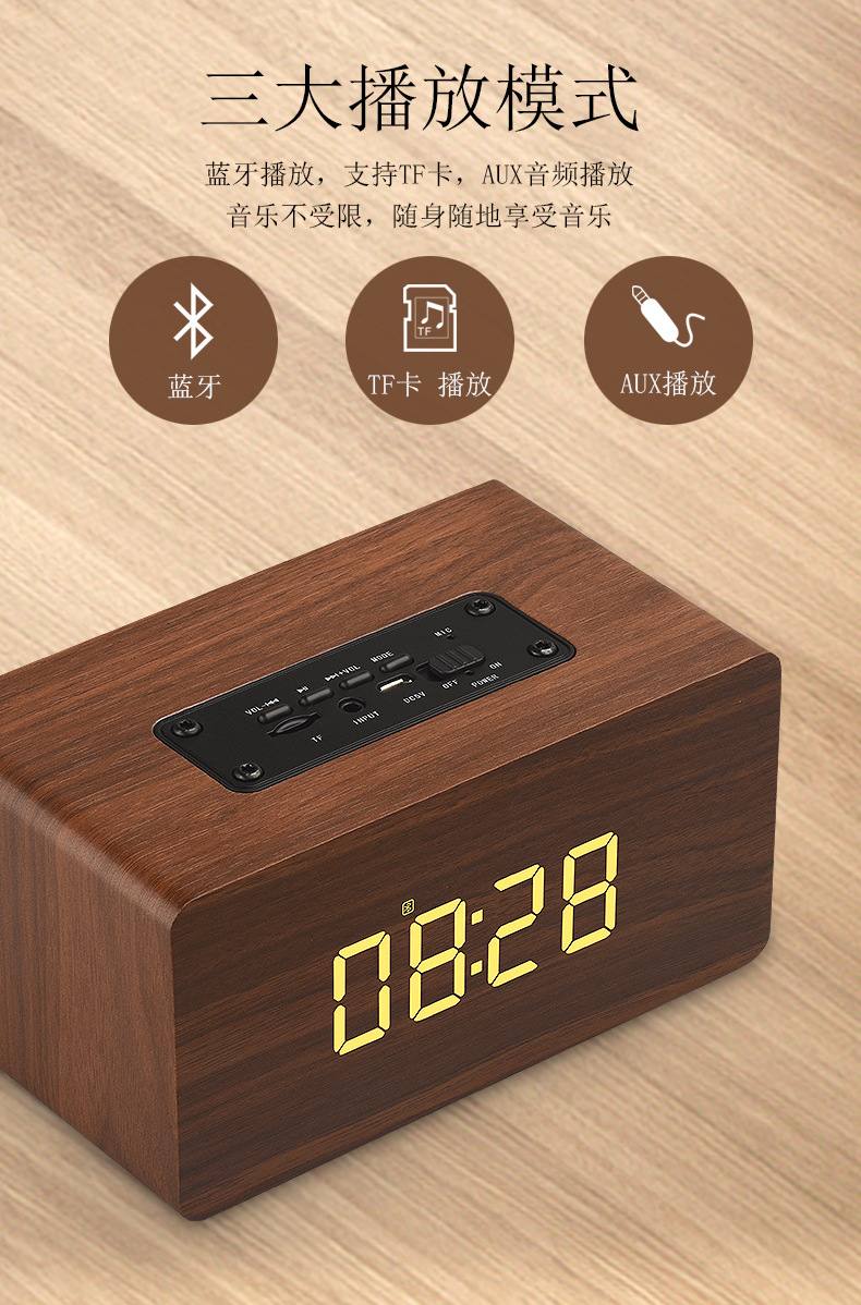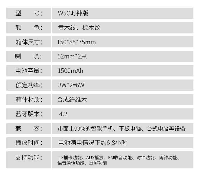关于FM功能:此款《W5C时钟版》木质蓝牙音箱以蓝牙和插卡为主功能,并附带FM功能,并不能保障每一个地区都能搜到台,若FM收不到台,请联系客服,沟通使用方式