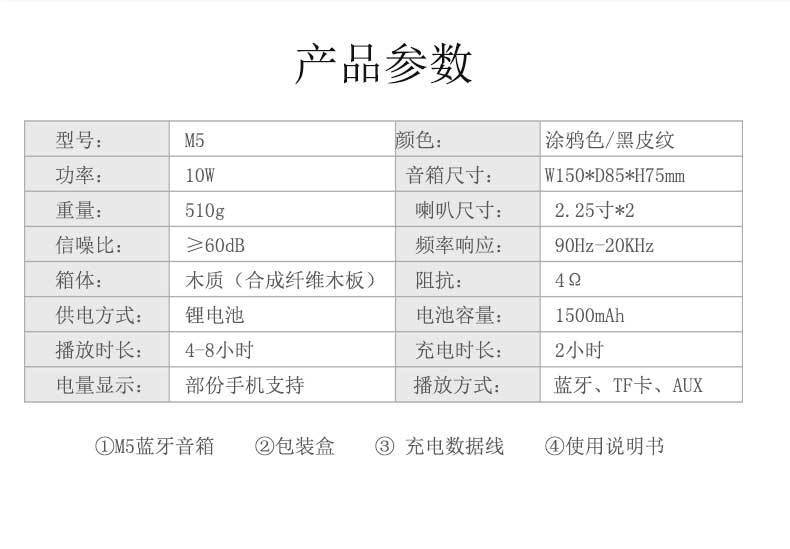 2.最大功率:10W 5.音箱尺寸:W150*D85*H75mm 3.电池:1500mAh 6.配线: 1条micro USB充电线