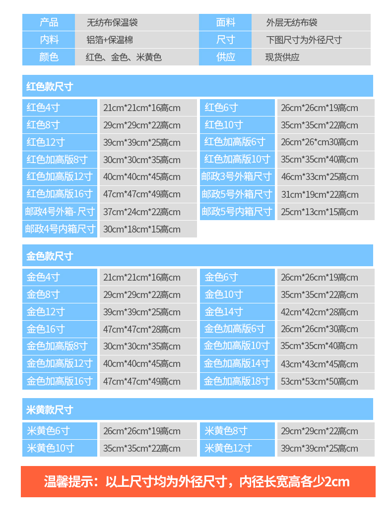 提示:保温袋,冰袋,它不是带电产品,所用的冷热能源都取决于食物本身,该产品原理就是起到延长时间的作用,保冷用时雪糕和冰淇淋是属于易化冷冻食品不推荐使用。但在短时间内可保温,如从商场购买雪糕和冰淇淋此类产品,把它放入此袋,等到家时还是那样的完美的。