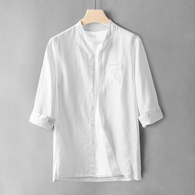 여름 얇은 남성 캐주얼 셔츠 린넨 스탠드 칼라 7부 소매 슬림 셔츠 중국 스타일 카디건 통기성 탑