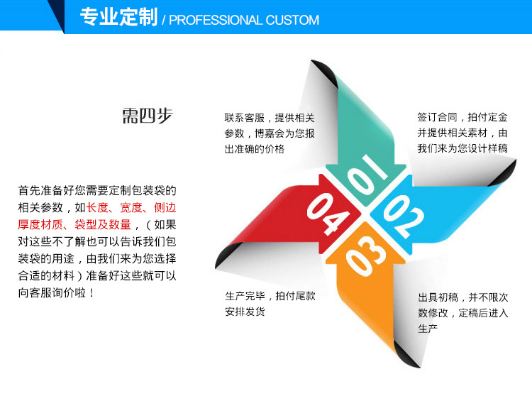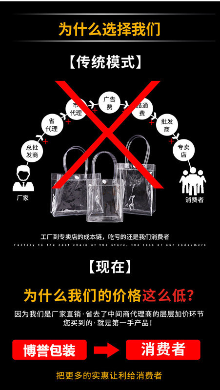 本厂即《温州市博誉包装有限公司》,是一家专业生产塑料袋生产厂家。建成于2007年,座落在中国印刷城(礼品城),本厂拥有先进的机器设备,样品设计能力,现有职工50于人,是一支视质量为生命,视客户为的职工队伍。本厂专业生产各种塑料袋,主营:PVC包装袋 PVC文件袋,文具袋,玩具袋,内衣袋,化妆品袋,被套袋,凹凸扣自封袋, 无牙拉链袋 PE高低压塑料袋,服装袋,超市购物袋背心袋,各种EVA袋 PP手提袋 PP盒 PET盒 PVC盒 等等。主要用途有服装厂,五金厂,文具厂,电器厂,礼品厂,玩具厂,化妆品厂,家纺用品厂,卫生用品厂,洗漱用品厂,酒店,超市,大商店,各种消费场所等,本厂将以的质量,的服务,合理的价格竭诚欢迎广大国内外客户来电,来人洽谈业务。