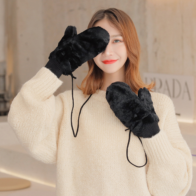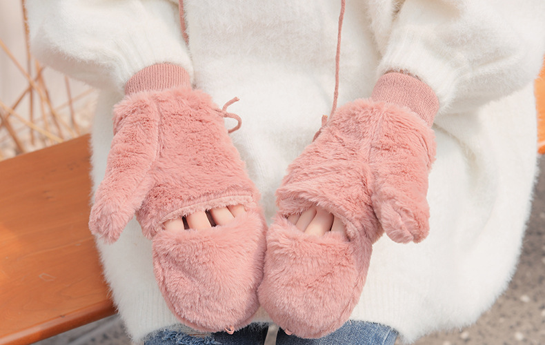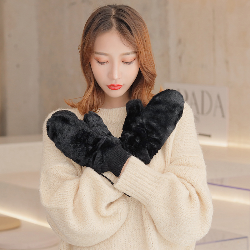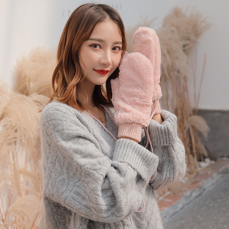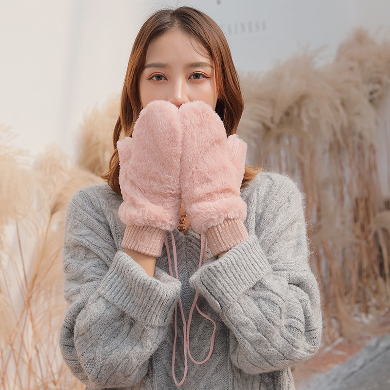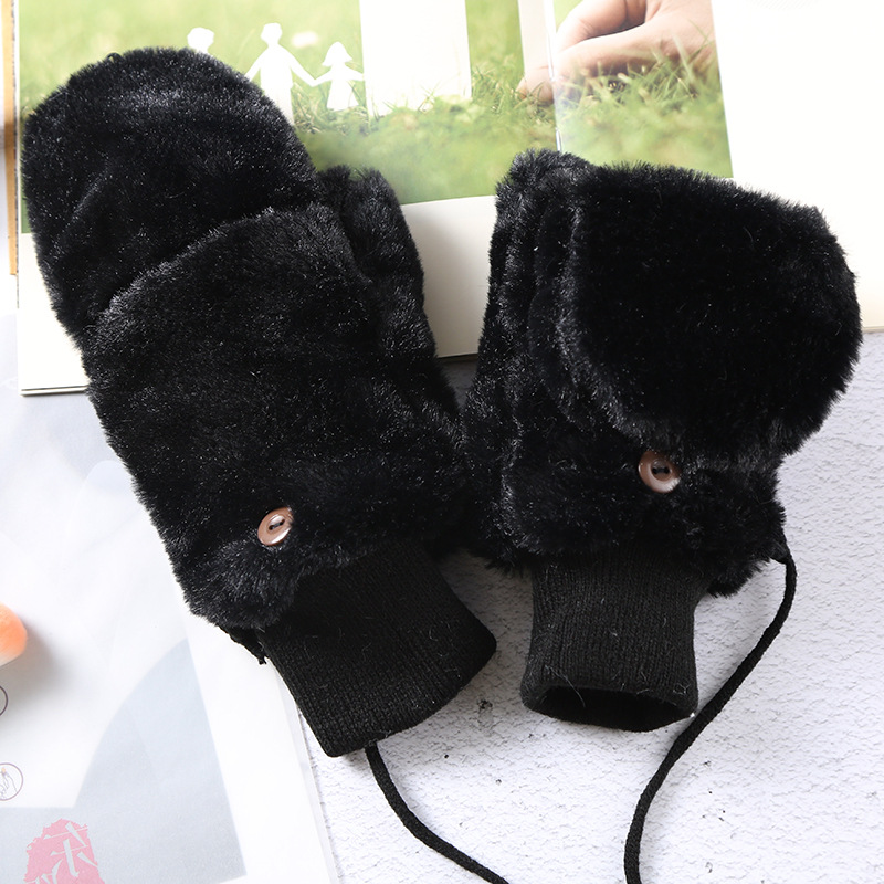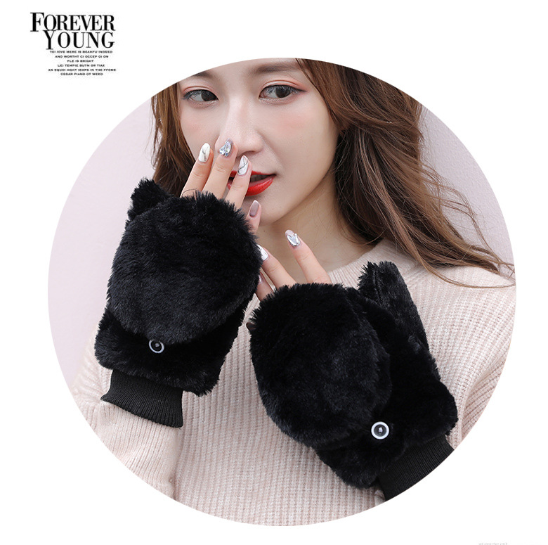 한국식 봉제 단색 장갑 귀여운 학생 따뜻한 이중 두꺼운 반 손가락 플립 커버 장갑 가을과 겨울 여성용