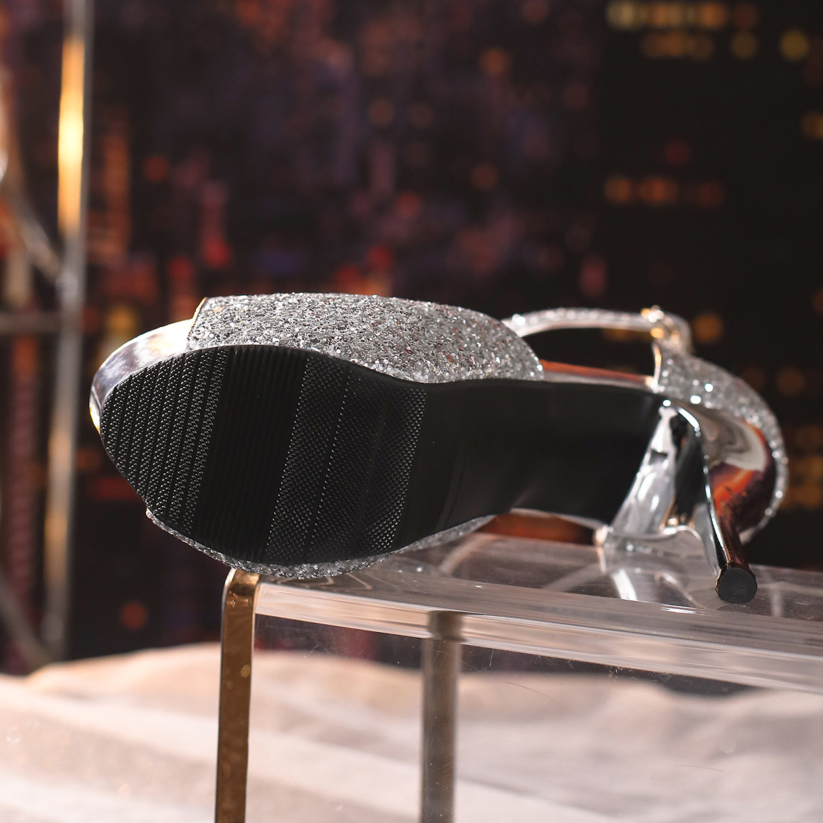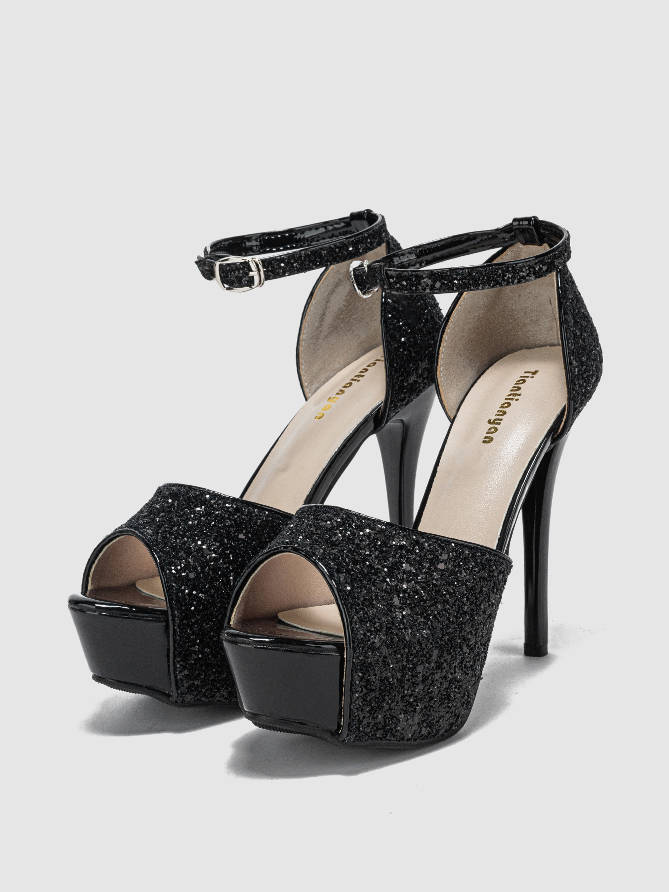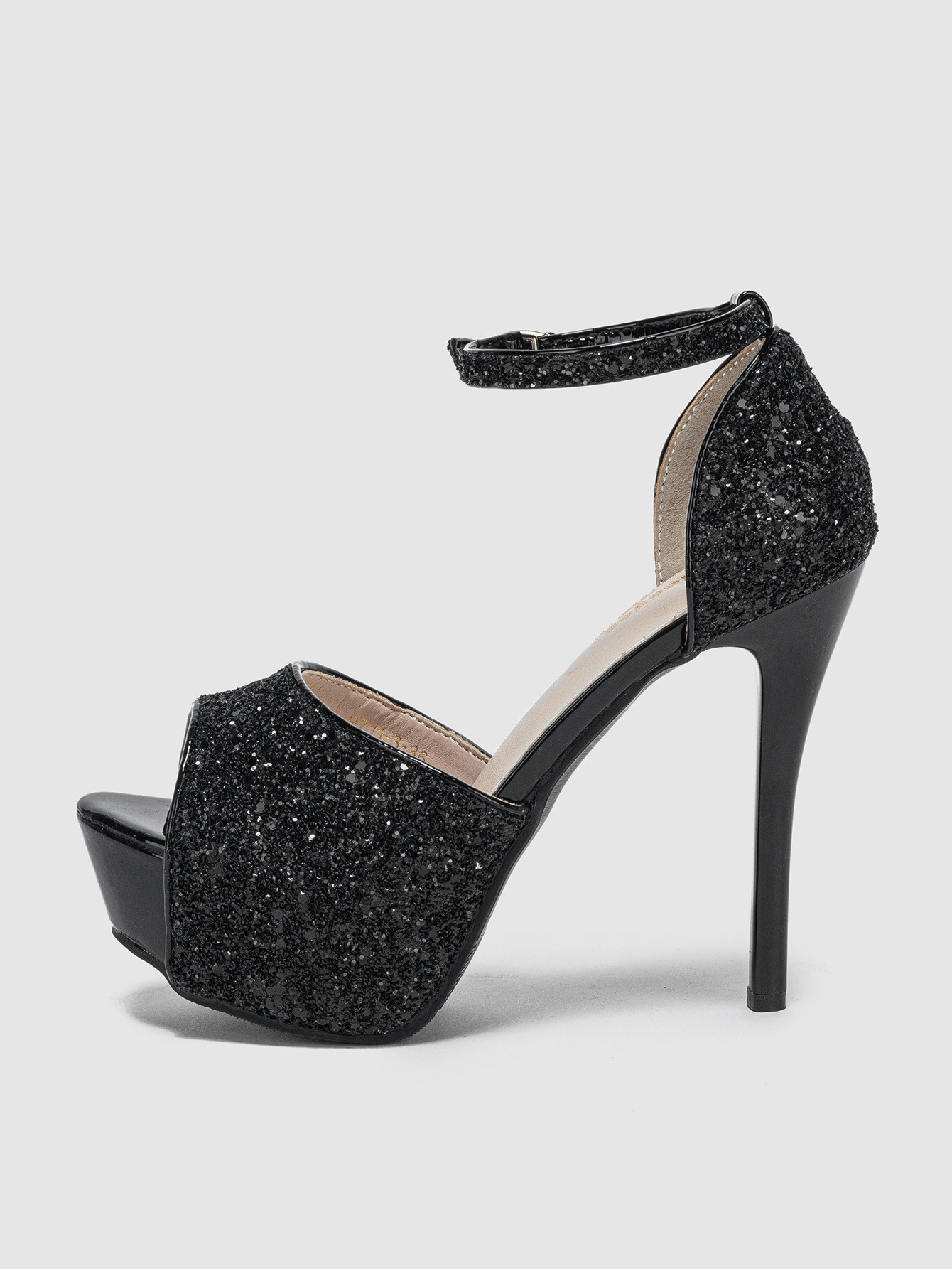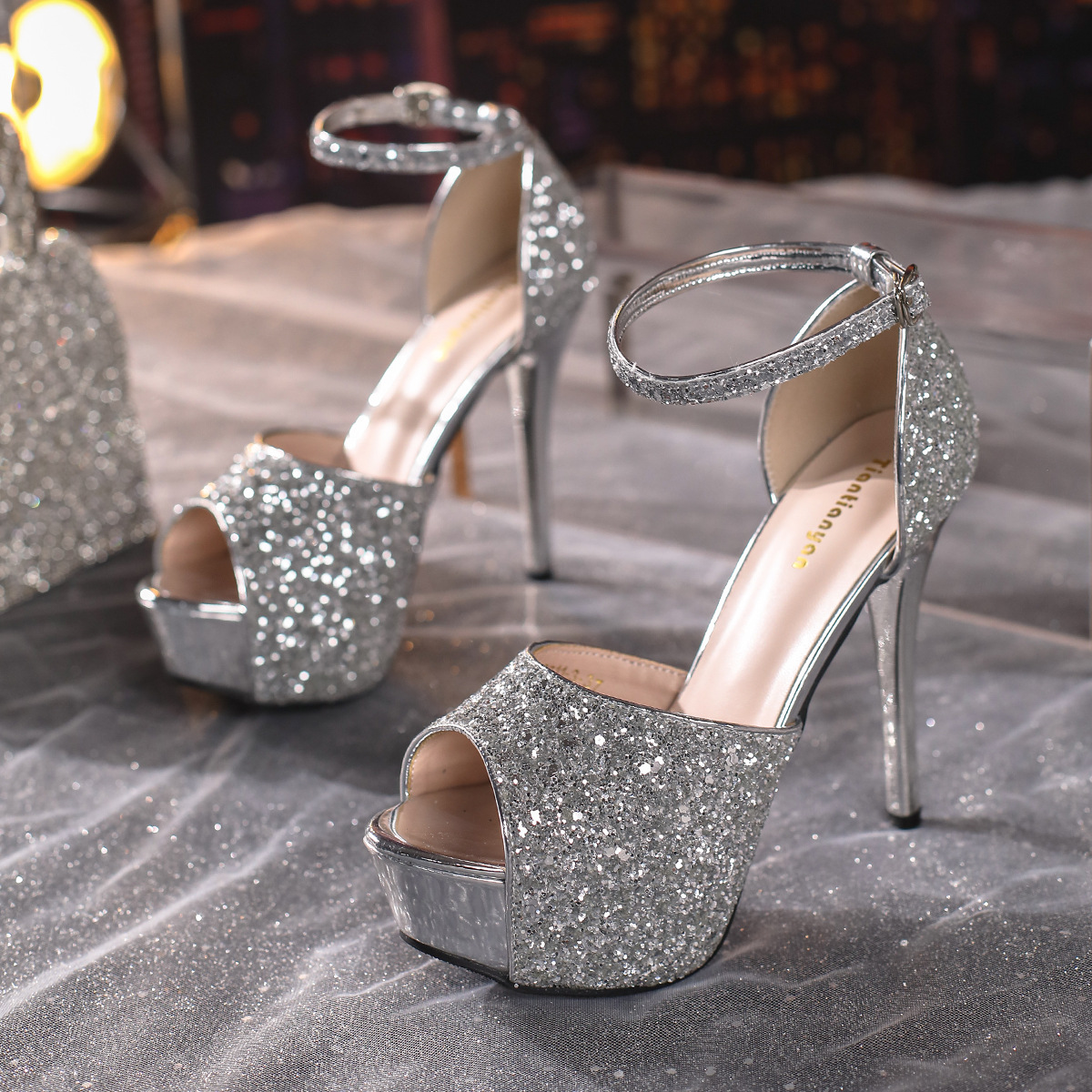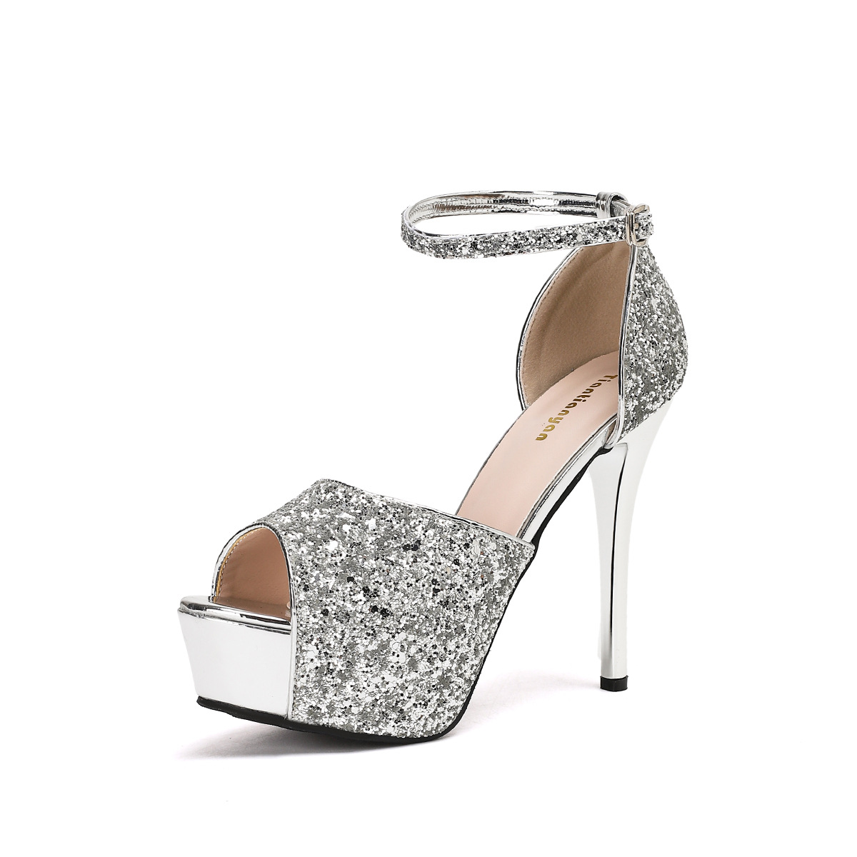 패션 금속 스팽글 연회 신발 스틸레토 힐 물고기 입 중공 플랫폼 버클 샌들 하이힐 9711-3