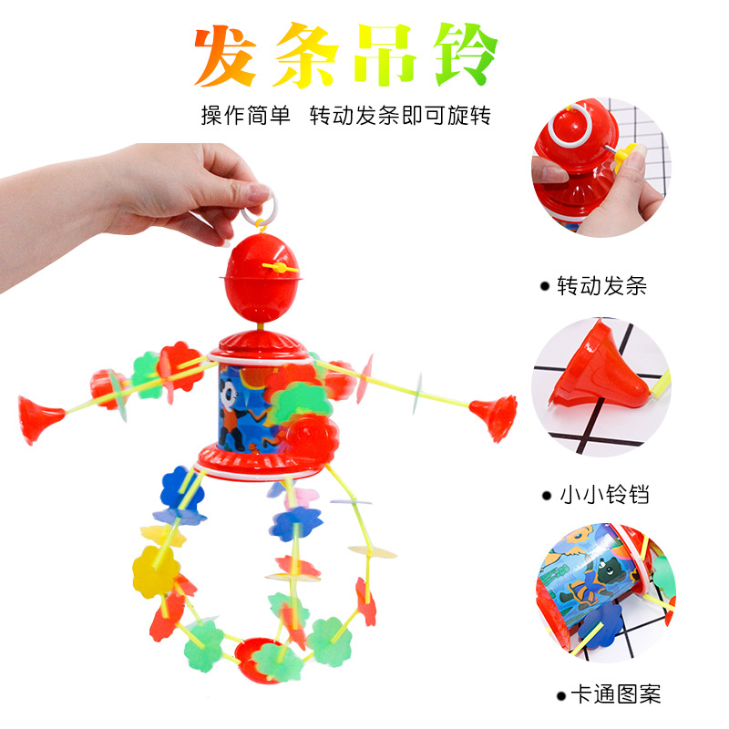 风铃顶端有个圆扣,可以挂在宝宝易看到的地方,也可用手提着逗玩宝宝,发条玩具,不用电池,环保实惠。