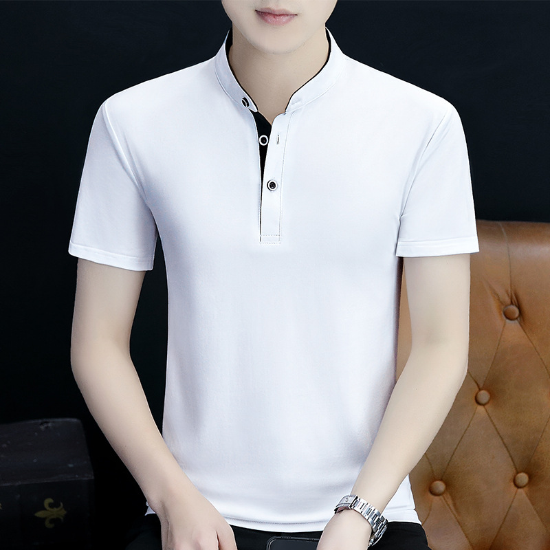 2025 신사복 폴로 티셔츠 바닥 셔츠 한국 남성 의류 스탠드 칼라 반팔 자비로운 탄성 슬림 남성 티셔츠