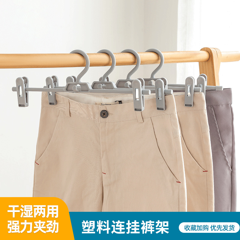 产品信息 产品名称:连扣夹子裤架 主要材质:优质pp塑料 产品重量:52g 产品尺寸:34cm*13cm 产品颜色:灰色、白色、杏色 、 乳白色、粉色 使用范围 :裤子、裙子、内衣等 产品特点:多用途,简约时尚、承重耐用 注:尺寸和重量为手工测量,会稍有误差,请以实物为准。