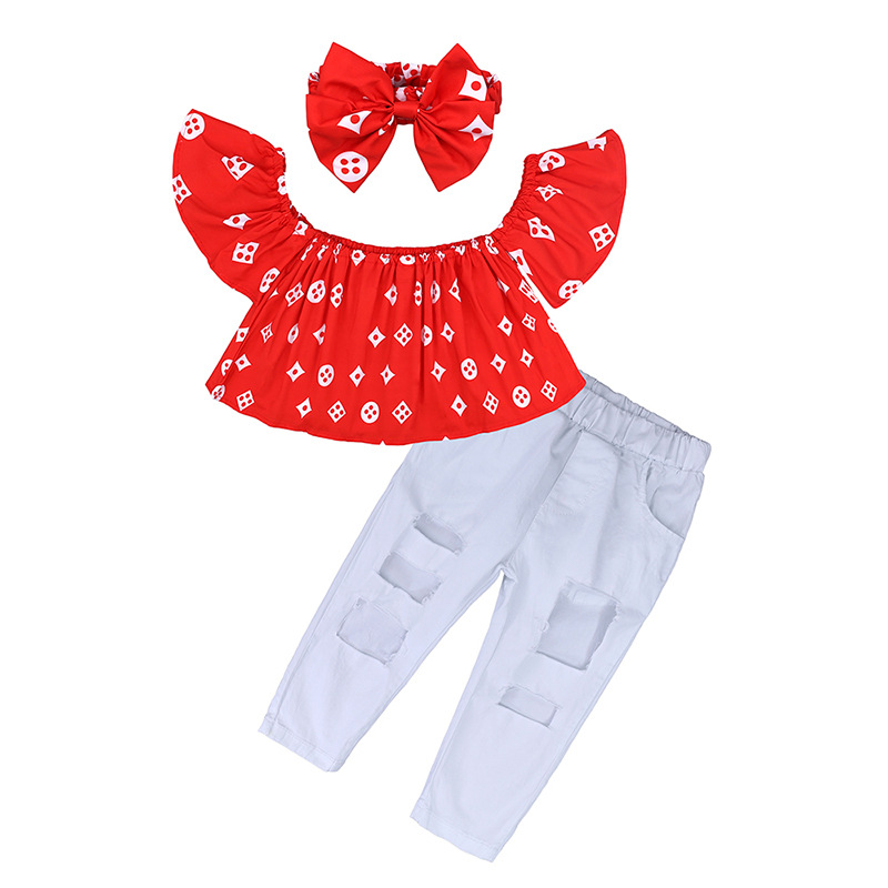 【款式】尚酷童装ins夏季女童套装红色一字肩上衣破洞牛仔裤头饰厂家直销