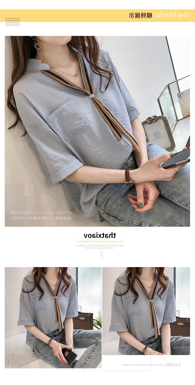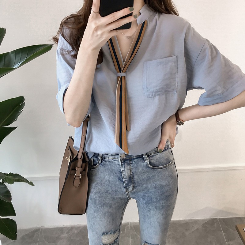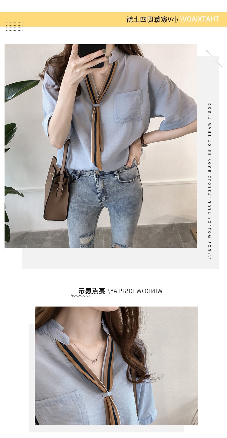 2023 여름 새로운 패션 스트라이프 타이 반팔 셔츠 여성용 루즈한 모든 매치 반팔 셔츠스토어 가기