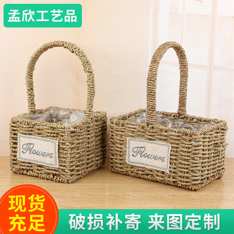 목가적 인 잔디 꽃 블루 시뮬레이션 분재 꽃 바구니 거실 발코니 꽃 바구니 짚 작은 긴 사각형 꽃 바구니 도매스토어 가기