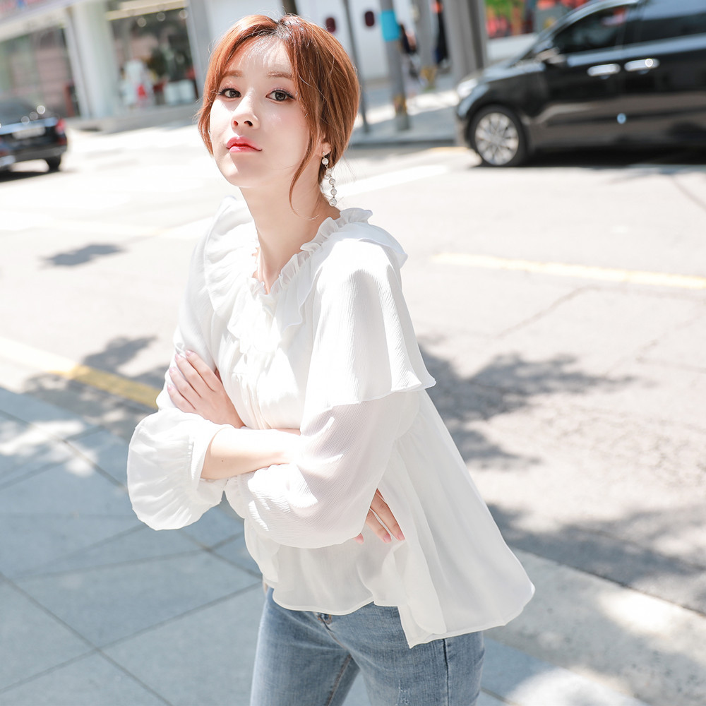 여자의 플러스 사이즈 쉬폰 셔츠 느슨한 레이스 V-넥 흰색 셔츠 긴 소매 한국 인형 셔츠 기본 셔츠 제조 업체 도매스토어 가기