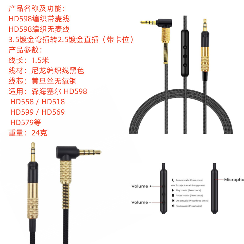 Yan HD598/558/518/599/HD579/HD569 헤드폰 교체용 오디오 연결 케이블 브레이드 내장 마이크스토어 가기