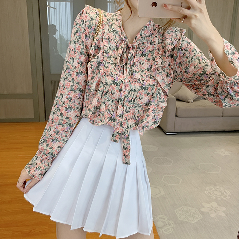 2024 봄 새 쉬폰 셔츠 여성용 한국식 긴팔 리본 프린트 활 셔츠 최고 슬리밍
