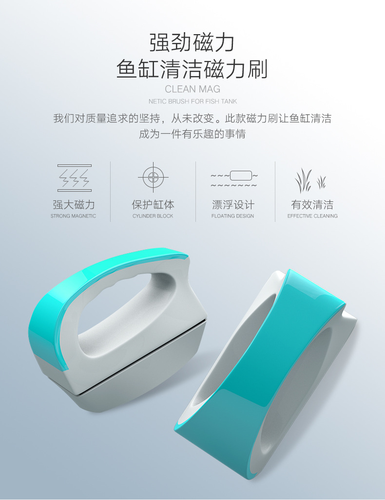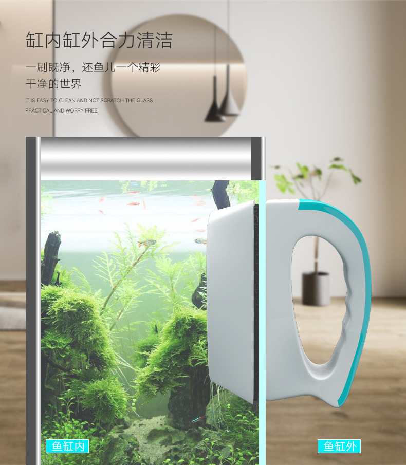 【商品介绍】这款双面磁力刷外侧采用眼镜布材质 可以清除水渍 内侧采用高密度纤维 可以轻易取出缸壁粘附物 青苔 真正做到清洁无死角 简约时尚的设计 值得信赖的品质 是我们极力推荐的一款鱼缸清洁产品!