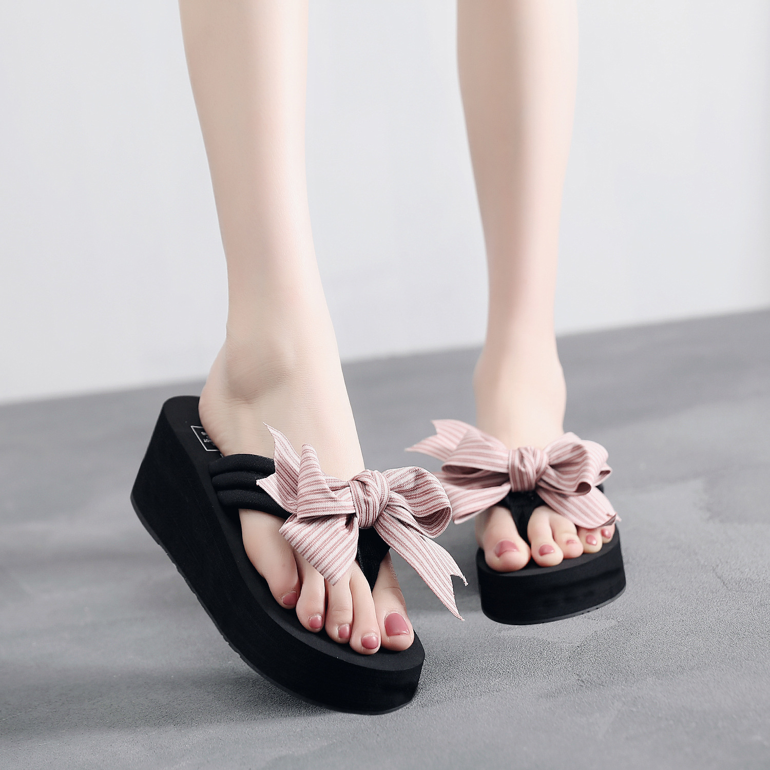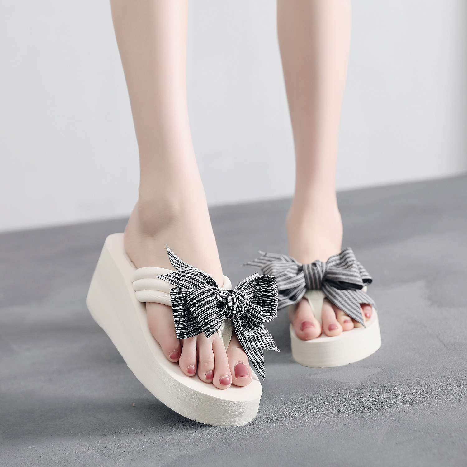 유럽 및 미국 하이힐 보우 플립 플롭 크로스 보더 스타일 빈 두꺼운 바닥 미끄럼 방지 샌들 소원 여성을위한 뜨거운 판매 휴일 슬리퍼스토어 가기