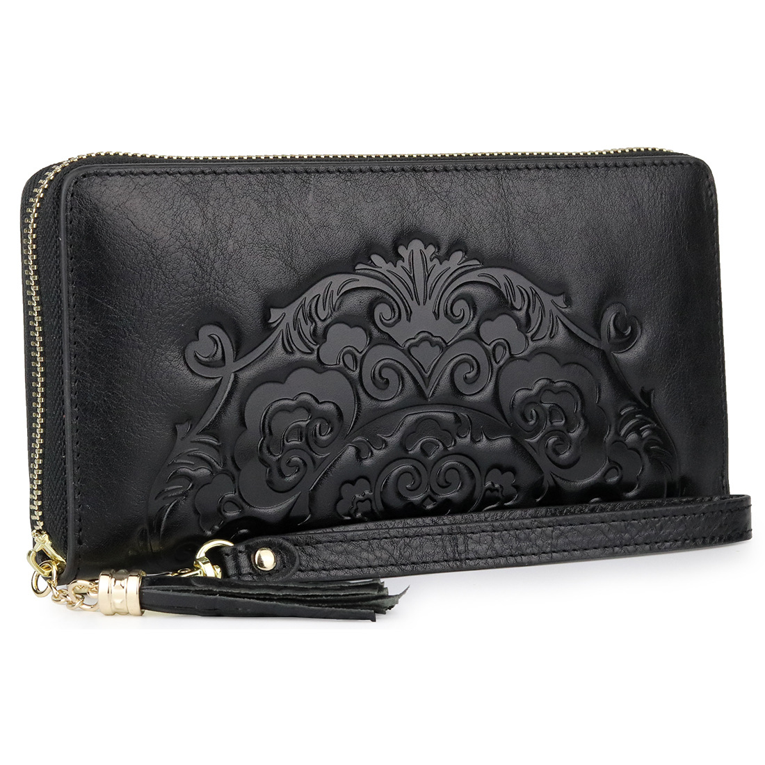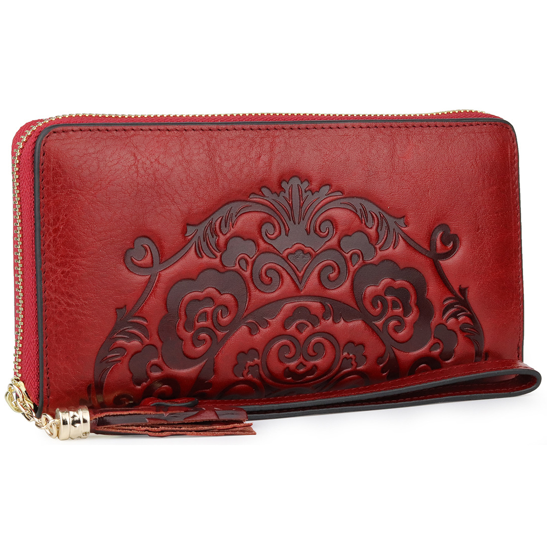 2021新款头层油蜡皮长款钱包 压花拉链包女流苏民族风女士手拿包