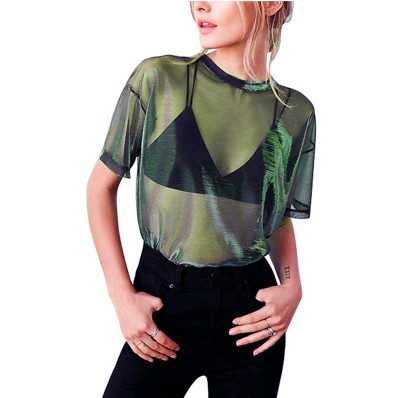 2023 AliExpress 폭발 유럽 역 레이저 메쉬 반팔 티셔츠 캐주얼 관점 탑 여성 5 색 4 사이즈