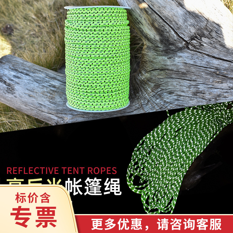 优质高反光帐篷绳,进口设备绕制,质量超好,直径4毫米。绳体纺织得相当浑圆紧密,表面纹理相当细致,耐磨性相当好,频繁摩擦后也不起毛,是户外玩家用品。