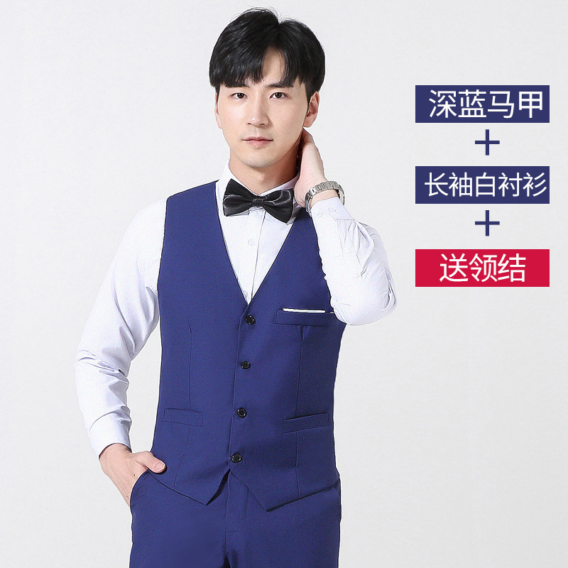 • 나비 넥타이를 보내는 다크 블루 양복 조끼 + 흰 셔츠