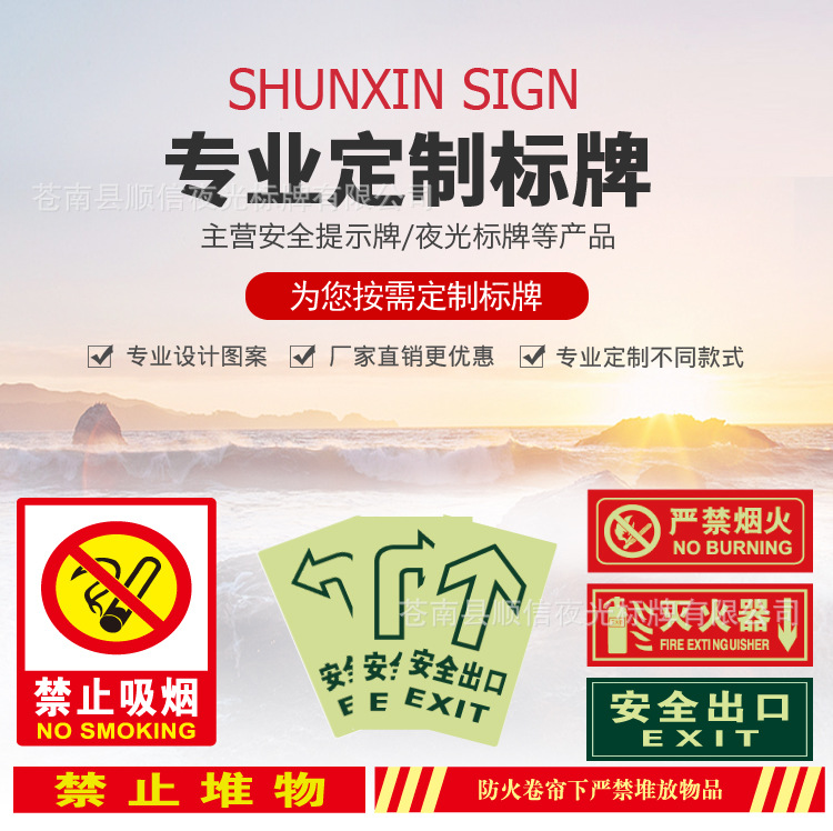 苍南县顺信夜光标牌有限公司主要生产加工安全提示牌,警告牌,禁止牌,夜光出口牌,消防提示牌,告示牌等产品,公司可为客户提供灵活的合作方式,可承接来样定制,也可为客户开发设计。夜光始终坚持“用户至上,以质量求生存”的宗旨,保持优质的产品、优惠的价格、优良的服务,以“不断创新、开拓进取”为奋斗目标,本着“和善、敬业、拼搏、超前”的理念,愿与各界朋友真诚合作,携手共进、共展宏图。欢迎各界朋友莅临参观、指导和业务洽谈。