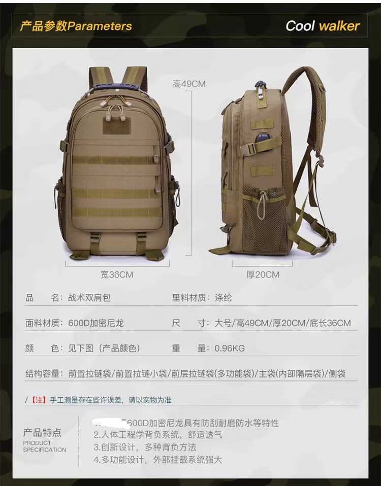 전술 가방 단색 스포츠 등산 여행 가방 야외 가방 남성과 여성을위한 대용량 다기능 방수 전술 배낭